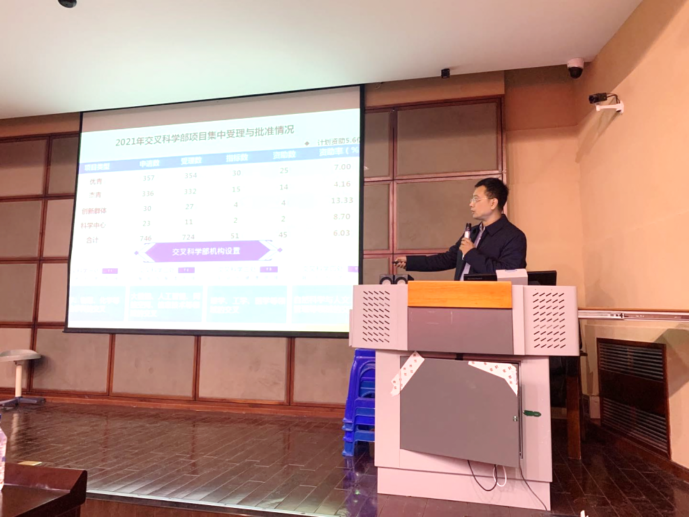 首先,董双石介绍了2021年英国上市官网365国家自然科学基金的申请与资助情况,并针对英国上市官网365的实际情况详细地分析了申请项目所属学部、申请的项目类型以及四个科学问题属性选择等方面的问题。他强调公司一直鼓励学科交叉合作,希望英国上市官网365教师可结合自身情况尝试申请基金委交叉科学部的项目,进一步加强化学与医学、生命科学等相关领域交叉融合,产出助力国家经济社会发展的原创性成果。他向在座教师介绍了公司在基金申请及后续辅助指导方面的相关措施,希望通过公司和公司的共同努力,有效提高英国上市官网365国家自然科学基金资助率。