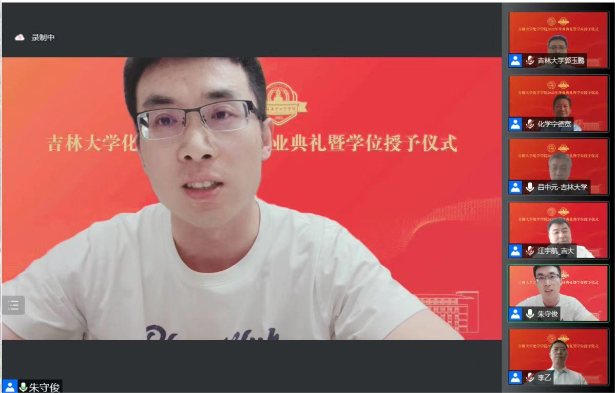 2018级博士研究生许银才同学代表毕业研究生发言,表达了对母校、对师长的不舍与感激。他说,吉大化学点燃了同学们求知的灯塔,教会了同学们成功的关键,给了同学们一把开启未来之门的钥匙。同学们有幸在知识的海洋里遨游,在文化的殿堂里徜徉,在思想的宝库里探索,在精神的圣地里成长,并继续在深爱的领域里奉献,“吉大化学学子”永远都是同学们人生中最自豪的称号。恰逢吉大化学学科创建70周年,他代表全体毕业生为公司送上了最真挚的祝福。
