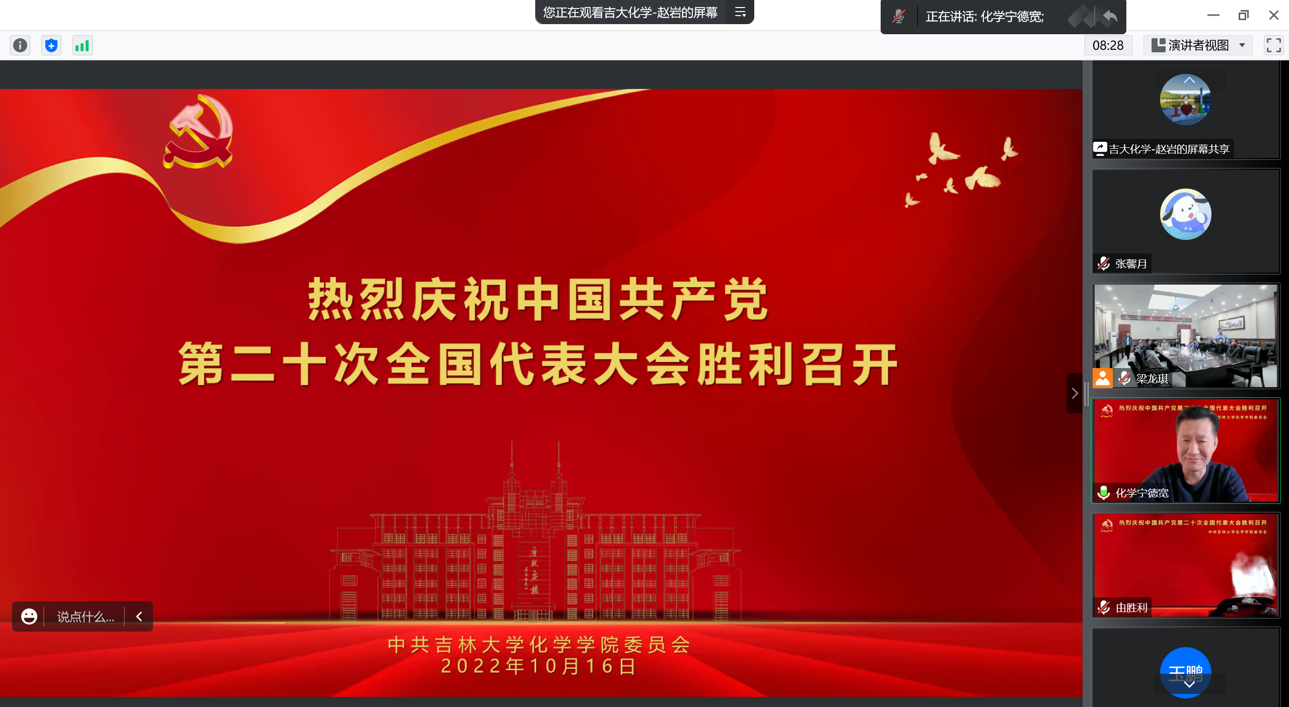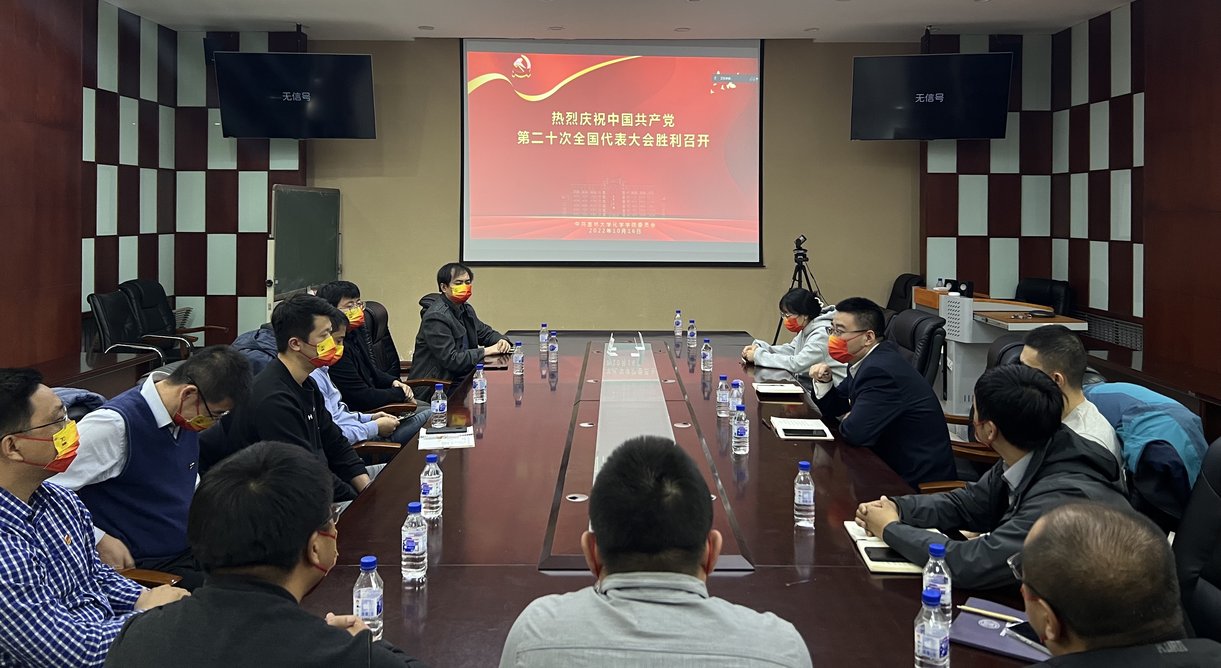 直播结束后,在唐敖庆楼A308会议室线下分会场集中收看的驻校教师和员工党员代表各抒己见,发表感悟,共庆中国共产党第二十次全国代表大会胜利召开!