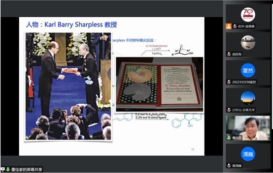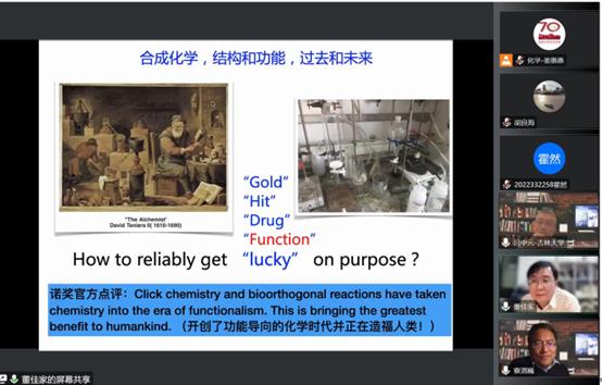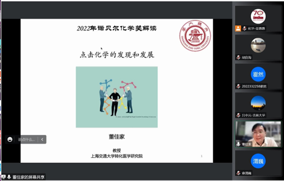 讲座中,董佳家教授围绕点击化学的发现和发展,深入浅出且幽默诙谐地介绍了 “点击化学”——模块化连接砌块分子,实现分子功能的理论本质,并对其开创了功能导向的化学时代进行了详细解读。同时分享了K. Barry Sharpless教授乐于学习、善于发现、勇于探索的科学精神以及Sharpless教授生活工作中的一些有趣的小故事。随后,董佳家教授激励广大学子,希望当代青年学者能够学习发扬老一辈化学家的科学精神,内化于心,外化于行,勇攀学术高峰。在交流互动环节,董佳家教授耐心详细地解答了院内外师生的问题,并对点击化学领域的发展做出了展望,英国上市官网365及其他院系200余名师生在线收看。