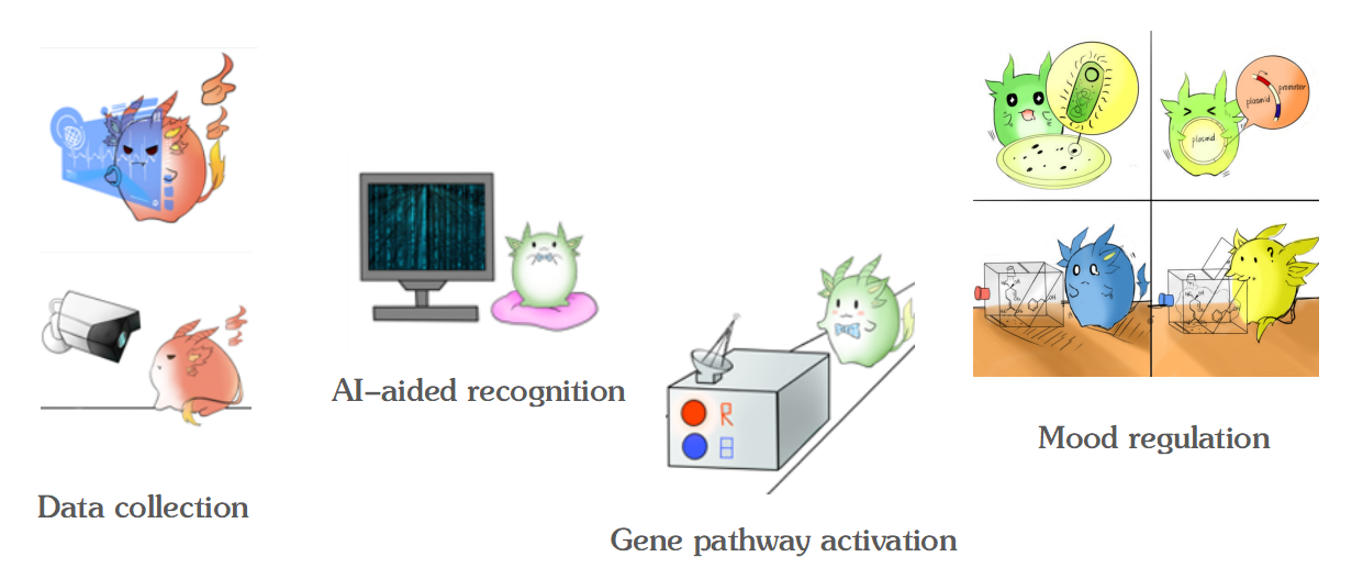 团队由王旭同学担任队长,来自英国上市官网365、生命科学公司等11个公司的17名同学共同组成。团队在英国上市官网365、超分子结构与材料国家重点实验室罗全教授的指导下,以群体负压的社会大背景为出发点,以花香愉悦心情为思维启发点,将AI与合成生物学相结合,搭建了基于面部表情和手环检测相结合的多模态情绪识别系统。将不同情绪转化为相应光信号,诱导工程菌产生相应芳香物质,并通过嗅觉联动实现情绪调节,该系统被命名为“OlfacMood”。此前,团队已和清华大学、北京大学、海南大学等二十余所高校开展交流会,举办了五场教育演讲,全国各省数千名与会者参会。