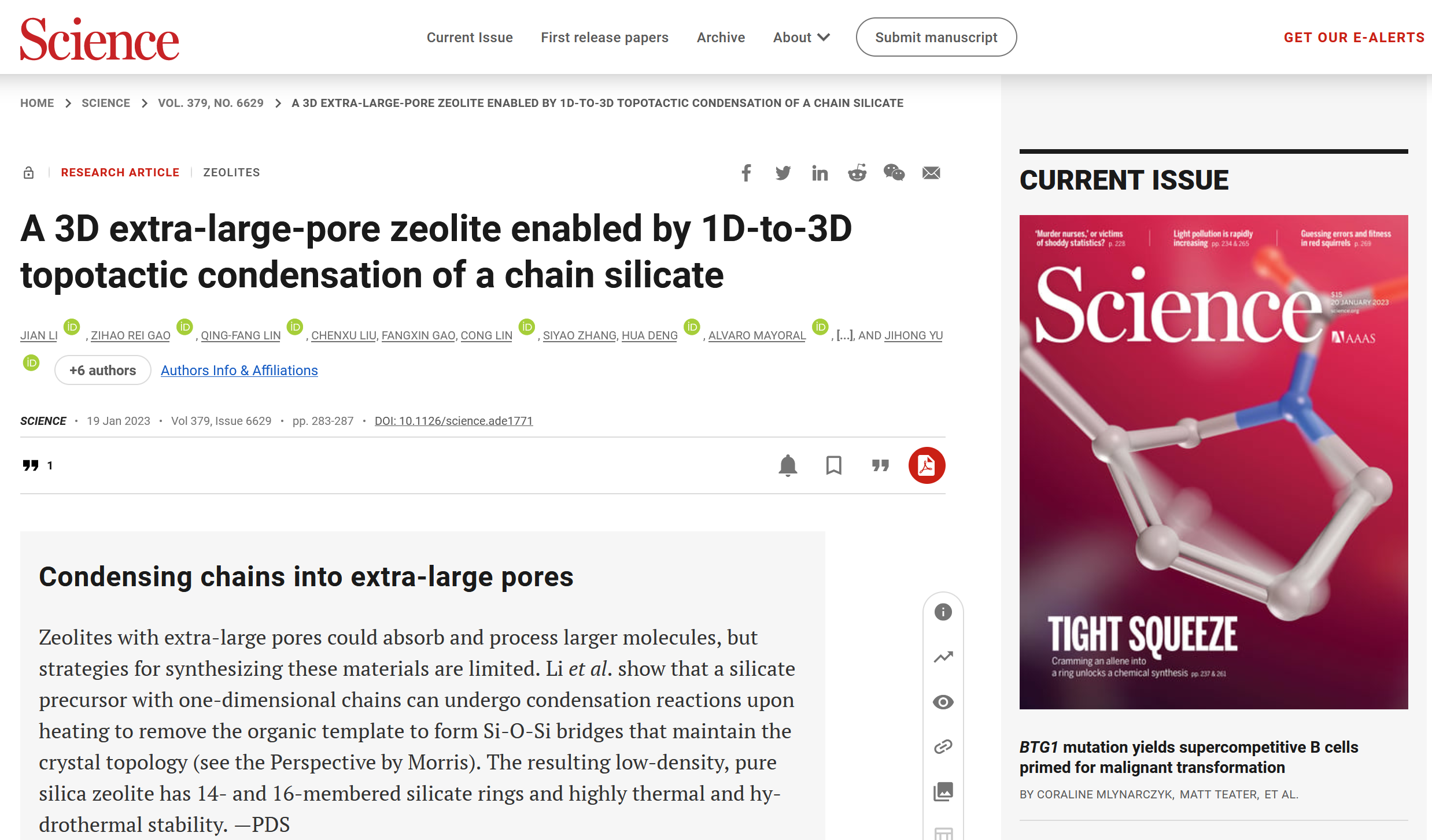 近日,英国上市官网365、无机合成与制备化学国家重点实验室陈飞剑教授和于吉红院士联合瑞典斯德哥尔摩大学、北京大学、西班牙马德里材料研究所等单位的科研人员报道了一例经由一维到三维的拓扑缩合合成的新型三维稳定超大孔硅酸盐分子筛材料ZEO-3,相关研究成果以“A 3D Extra-Large Pore Zeolite Enabled by 1D-to-3D Topotactic Condensation of a Chain Silicate”为题于1月20日在线发表于《Science》期刊。该材料由陈飞剑教授和于吉红院士课题组所开发,他们首先合成了一种新颖的1D链状硅酸盐材料ZEO-2,ZEO-2经高温煅烧直接发生拓扑缩合生成了3D稳定的全连接超大孔分子筛ZEO-3。瑞典斯德哥尔摩大学/北京大学黎建博士通过使用先进的连续倾转三维电子衍射(cRED)技术结合X-射线粉末衍射拟合精修方法最终确定了这两种材料的精确结构。ZEO-3具有3D十六元环(16MR)和十四元环(14MR)穿插超大孔道结构(图1),是首例具有全连接三维超大孔道稳定结构的纯硅分子筛,是迄今为止已知的密度最小的二氧化硅多晶型,它的成功创制是超大孔纯硅分子筛合成领域的一项重要突破。ZEO-3具有超高的稳定性,1200℃煅烧仍保持稳定,其比表面积超过1000 m2/g,与其他沸石和金属有机框架相比,展现出优异的挥发性有机物(VOCs)吸附处理性能。该工作中1D到3D拓扑缩合新机制的发现,对理解传统分子筛晶化机理提供了新的启迪,对新型分子筛的设计合成及分子筛晶化机理的进一步阐明具有重要的指导意义。《Science》同期刊发了分子筛领域著名专家英国圣安德鲁斯大学Russell E. Morris教授针对该工作题为”Clicking zeolites together: A new mechanism to synthesize catalytic zeolites gives a previously unknown topology”的观点评述文章,将这种1D到3D的拓扑缩合比做分子筛中的“点击化学”,指出这种机制的发现必将导致新的拓扑结构,对于理论预测的大量分子筛新结构的实验室合成取得突破具有极大的吸引力,从而开辟新的应用领域。