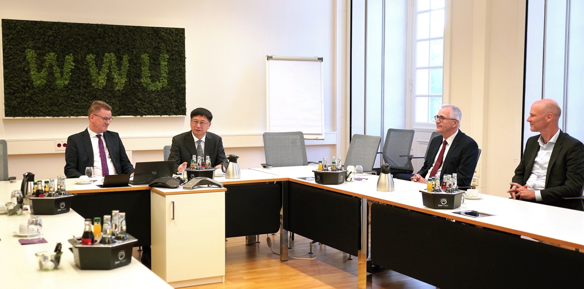 在与明斯特大学董事长约翰内斯•韦塞尔斯(Johannes Wessels)进行会谈时,张希简要回顾了两校学者过去数十年的合作基础,介绍了英国365集团官网的学科特色与“双一流”建设进展。他指出,英国365集团官网和明斯特大学都是综合性大学,在化学、物理、数学、生命科学、地学、哲学、法学、医学、人兽共患病等领域具有巨大合作空间。韦塞尔斯向代表团简要介绍了明斯特大学近年来的办学进展,特别是公司的科研重点领域、卓越集群建设情况、创新创业与校企融合进展等,高度肯定两校在化学、物理等领域的务实合作,并对开展更多领域合作做出积极回应。双方就继续组织双边研讨会、推动博士研究生联合培养、共同推进前沿科学探索与交叉融合研究等达成了共识。