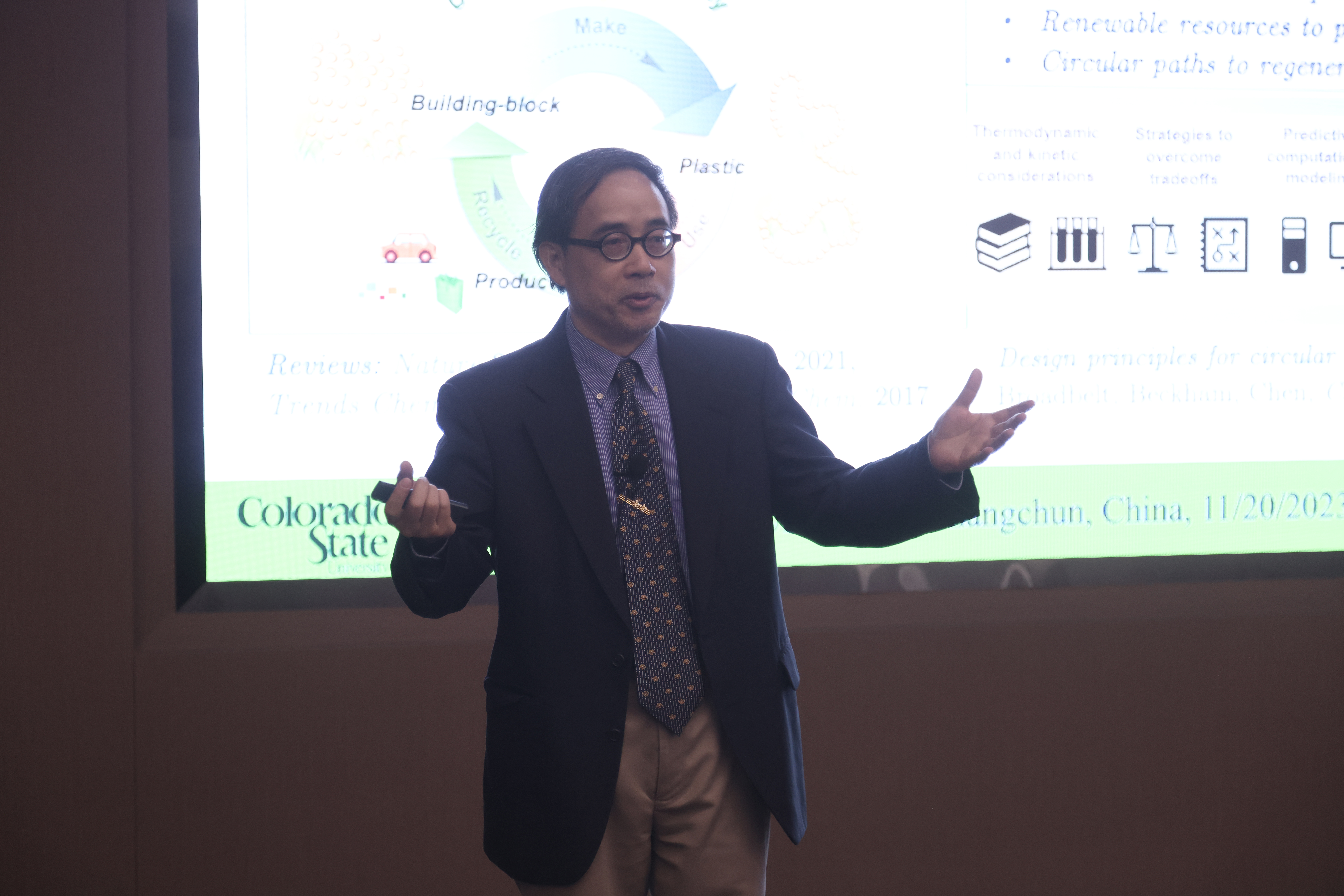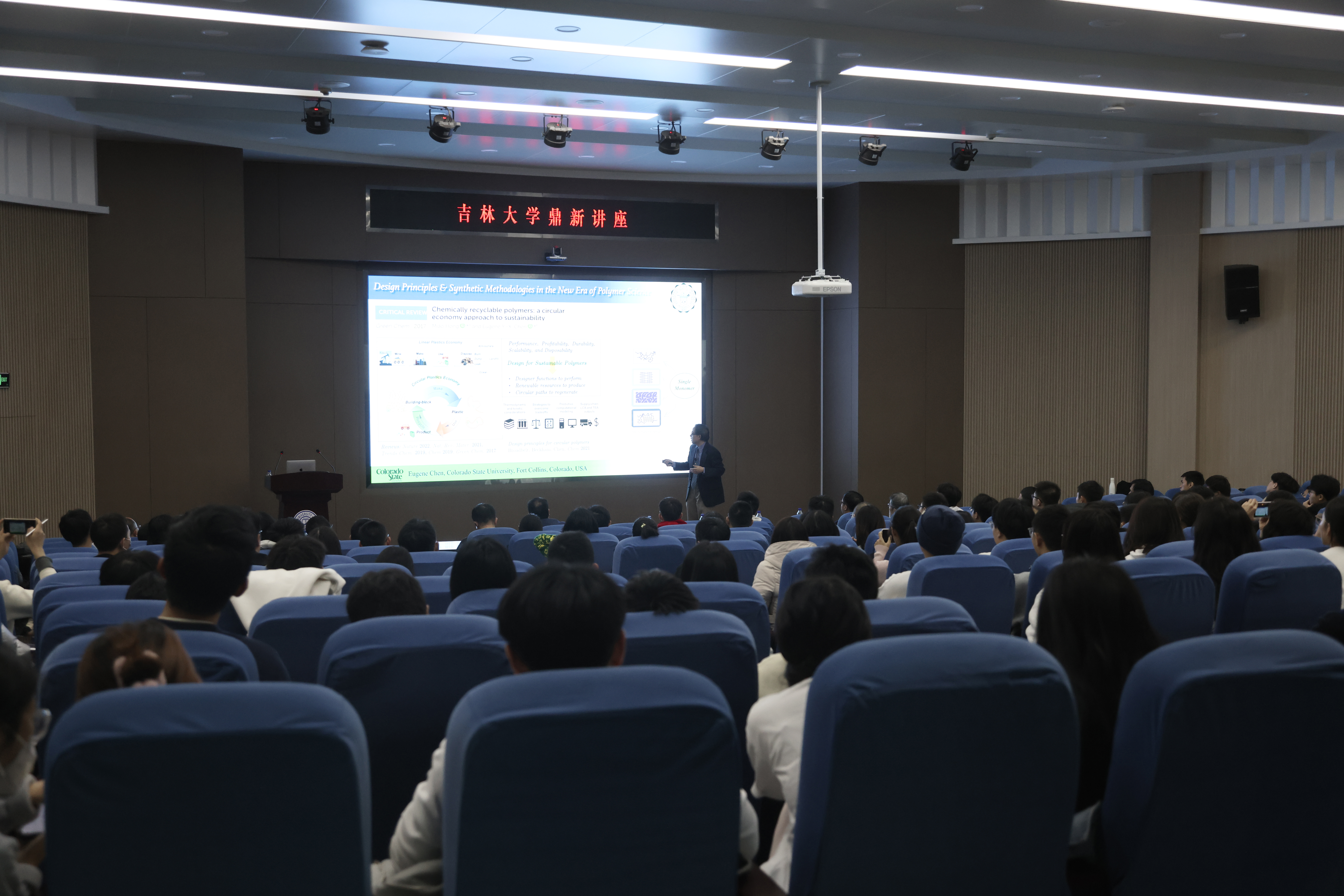 在讲座中,Eugene Chen教授认为聚合物科学的新时代已经到来,开发高性能可解聚循环的新型聚合物体系已成为循环经济发展新时代的需求,并介绍了其课题组在解决该问题方面取得的最新进展和重要贡献。他从最基本的物理化学原理出发,向师生解释如何利用动力学捕获机制来设计可解聚的高分子体系;着重介绍了其课题组依据该设计原理开发出的一系列具有可化学回收特性的内酯、硫酯和酰胺等新型闭环回收单体,并展示基于这些单体的催化聚合与解聚研究成果。Eugene Chen教授最后还抛出一个重大挑战:“如何只利用单一单体实现高性能高分子的按需定制?”他给出一种基于丙交酯单体的可能方案:通过催化聚合控制序列与立构,实现多样化高分子链的精准制备。虽然只是初步尝试,但他展示的结果依然将本次报告推向高潮。