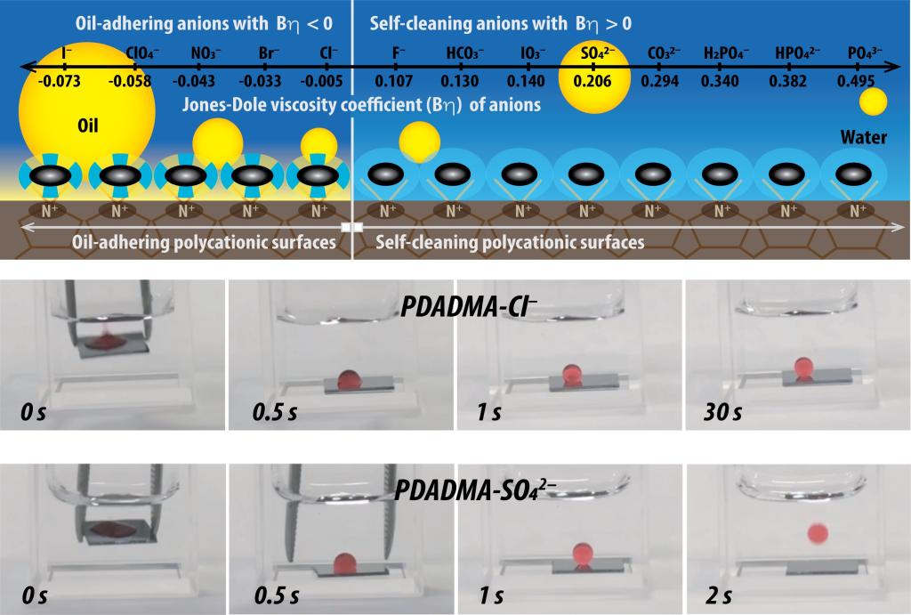 近日,英国365集团官网汪大洋教授课题组与其墨尔本皇家理工大学、东南大学、长春建筑大学的合作者一起基于阳离子表面水驱动的油去润湿行为,首次从实验上选择性地分析不同阴离子的水合能力的差异。基于聚二甲基二烯丙基氯化铵(PDADMA-Cl)的季铵盐重复单元的特殊的各项同性的分子构型和季铵盐独有的无水合层的特点,汪大洋教授团队设想PDADMAC阳离子模型表面的表面的亲水性主要反映其表面抗衡阴离子,氯离子(Cl-)的水合能力。借此,通过简单的表面离子交换,所制备的PDADMA-Cl的氯离子可以被一系列阴离子替换。通过分析携带不同表面抗衡阴离子的PDADMA表面水驱动的油去润湿性,表面抗衡阴离子可以很容易分成两类,一类如硫酸根离子(SO42-)可以实现水驱动的油完全去润湿性,即(水驱)自清洁,而另一类如氯离子(Cl-)在水驱动下可以牢固地吸附油滴,即(水下)油粘附。从表面技术层面上,这个实验发现提供了可能是目前最为简便的实现表面自清洁的涂层技术,它可以允许我们简易便捷地构筑各种具有自清洁功能的滤膜,比如用于油水分离。