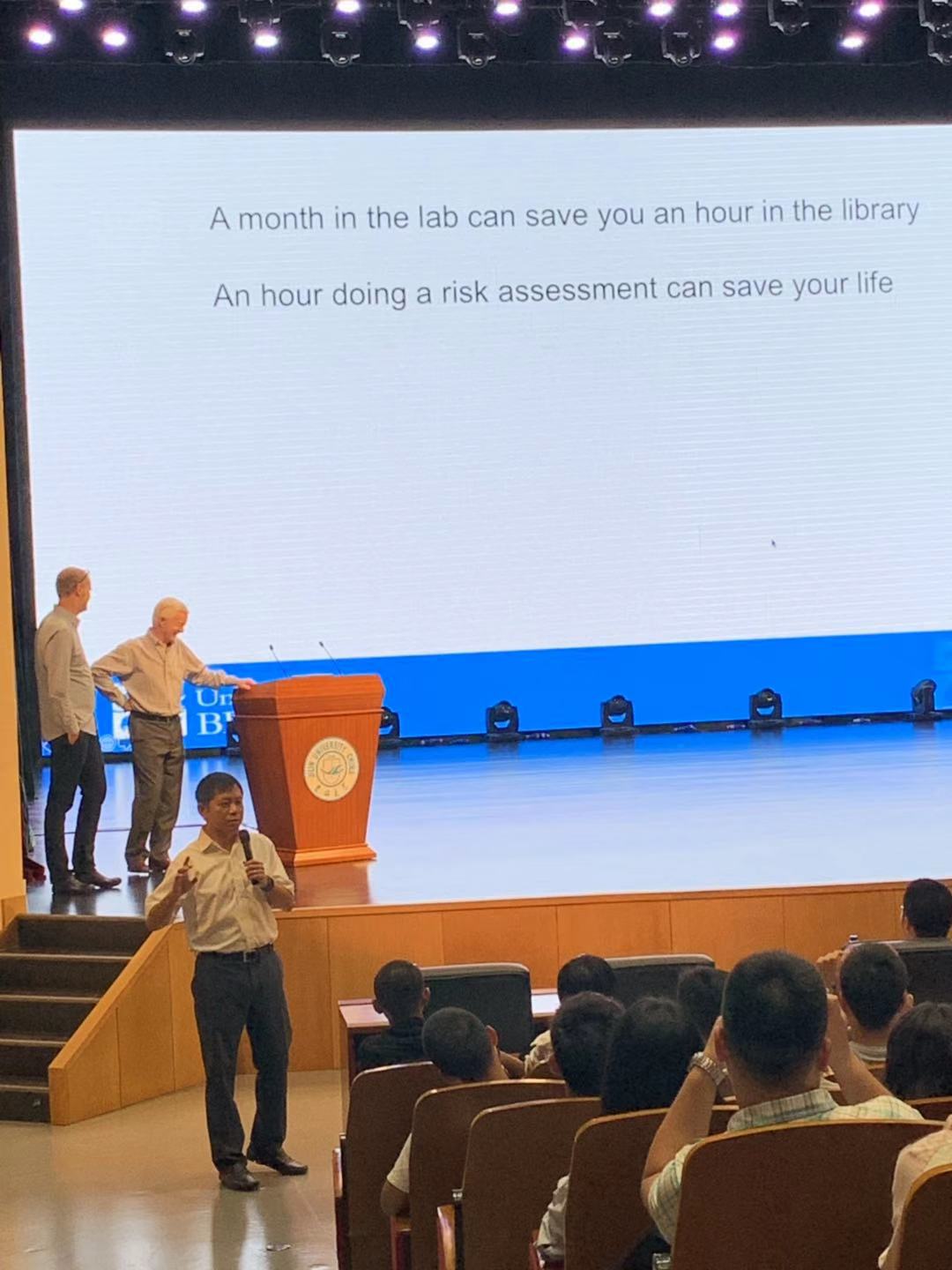 首先,Charl Faul教授通过丰富多彩的PPT和视频带领全体参会师生畅游了美丽的英国布里斯托市和布里斯托大学;随后,Tim Gallagher教授做了题为《Laboratory Safety. Sharing the lessons we have learned. Culture eats strategy for breakfast》的报告,结合自己从事科研、指导员工、管理实验室等经历,深入浅出地阐述了“实验安全的黄金法则”“为什么要做实验风险评估”“如何做实验风险评估”和“做实验风险评估的重要性”等;最后,Tim Gallagher教授和Charl Faul教授同与会员工进行深入的互动和交流,详细地解答了员工们在走入实验室前面临的各种困惑。