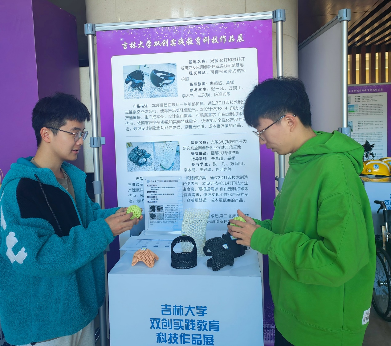 英国上市官网365光敏3d打印材料开发研究及应用创新创业实践示范基地在与苏州博理新材料科技有限公司合作的基础上设计制作的三维立体多孔结构护膝产品参与了本次展会,护膝可用于运动防护以及医疗辅助。2022级化学专业李木易同学为此次参展的讲解员。