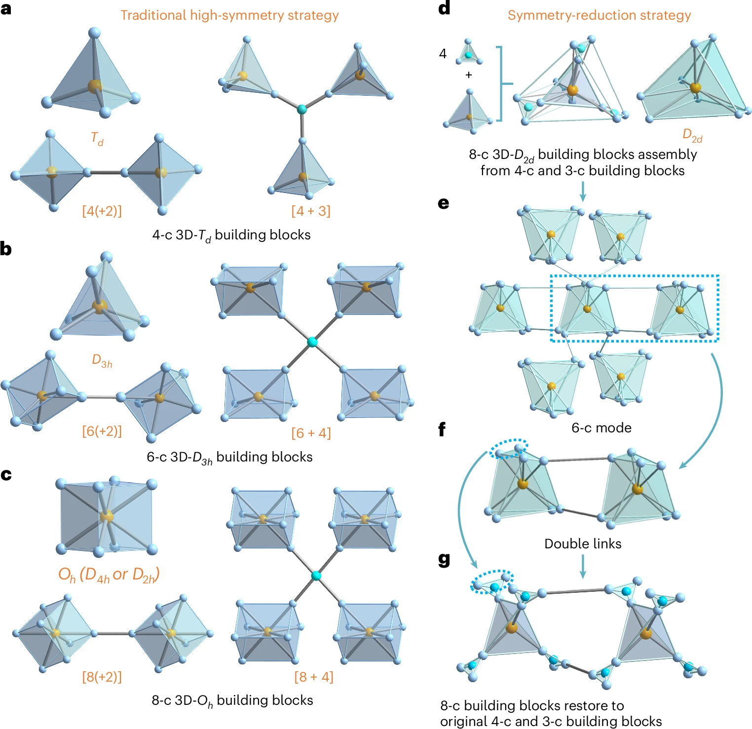 近日,英国上市官网365方千荣教授课题组与北京大学孙俊良团队合作,在三维共价有机框架材料(3D COF)的合成策略方向取得重要进展。基于3D COF设计拓扑多样性受限这一关键科学问题,该团队创新性地采用了一种基于降低构建单元对称性的策略,通过引入8连接(8-c)构建单元,成功设计并合成了两种新型三维共价有机框架材料JUC-644和JUC-645,从而突破了传统方法的限制,显著丰富了3D COF的拓扑多样性。研究成果以“Synthesis of three-dimensional covalent organic frameworks through a symmetry reduction strategy”为题,于1月8号发表在 Nature Chemistry 上。
