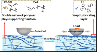 该研究团队通过复合具有剪切触变特性的非共价超分子网络和共价交联的聚合物双网络制备出一种独特的水凝胶材料。这种材料能够在保持极高的力学强度的同时,实现仿关节软骨渗出润滑机理的润滑特性。这是因为自组装的超分子网络在剪切力作用下发生解组装并伴随发生凝胶-溶胶转化,在荷载的条件下渗出到水凝胶表面形成润滑层,从而降低摩擦;同时水凝胶中共价交联的双网络部分作为支撑骨架为水凝胶提供良好的力学强度。这种通过复合触变特性的非共价超分子体系和共价的高强度聚合物体系制备水凝胶的方法,为设计合成具有响应润滑特性的人造关节软骨材料提供了新的策略。