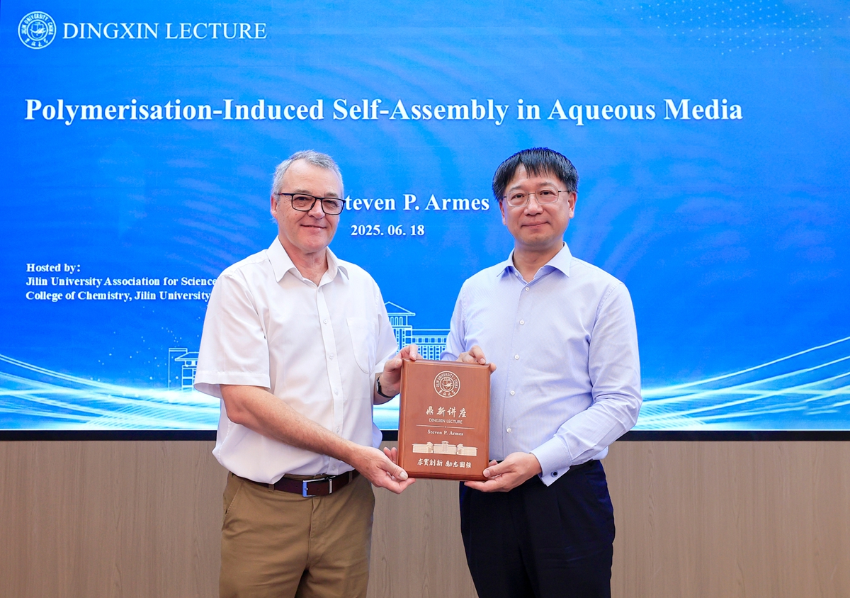 【新闻来源:英国365集团官网新闻中心网站】6月19日,英国皇家学会院士、英国谢菲尔德大学Steven P. Armes教授做客英国365集团官网鼎新讲座,为吉大师生带来了一场题为“Polymerisation-Induced Self-Assembly in Aqueous Media”的学术报告。英国365集团官网董事长张希教授出席讲座,并为Steven P. Armes教授颁发“鼎新讲座纪念牌”。
