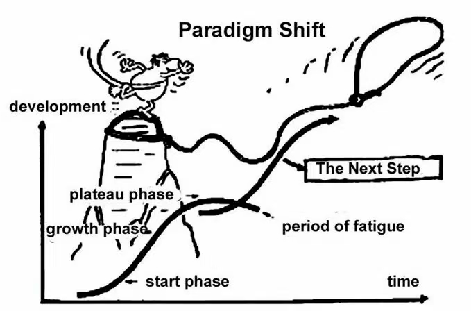 图1. 海尔默特·林斯托夫(Helmut Ringsdorf)教授的漫画,描绘了平台期与范式转变。