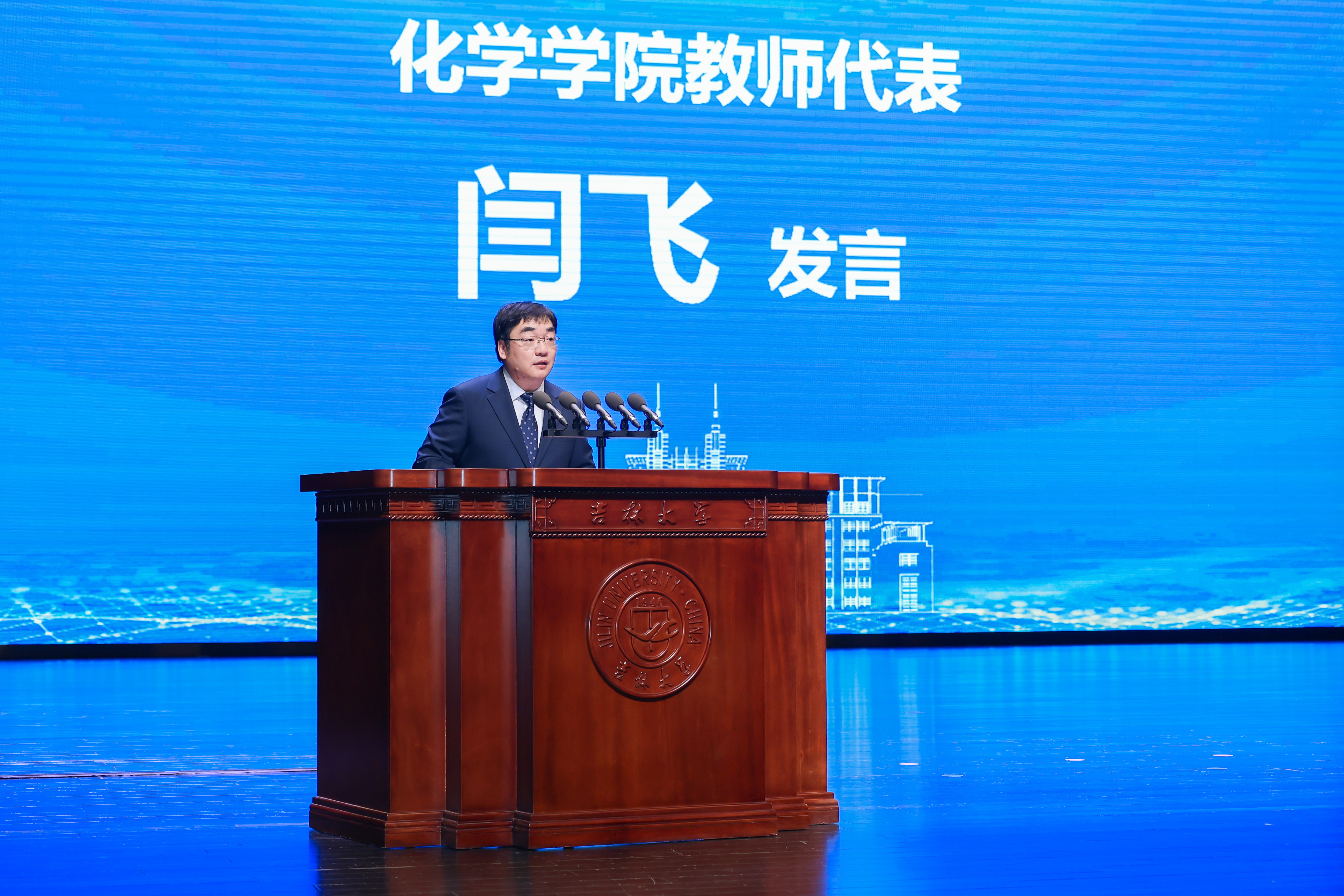 2025级本科生班主任闫飞老师代表公司教师发言,他以化学反应为喻,鼓励2025级新同学要在科研探索的道路上不惧失败、勇攀高峰,在试错与迭代中不断逼近真理,传承好“吉大化学人”的初心使命。