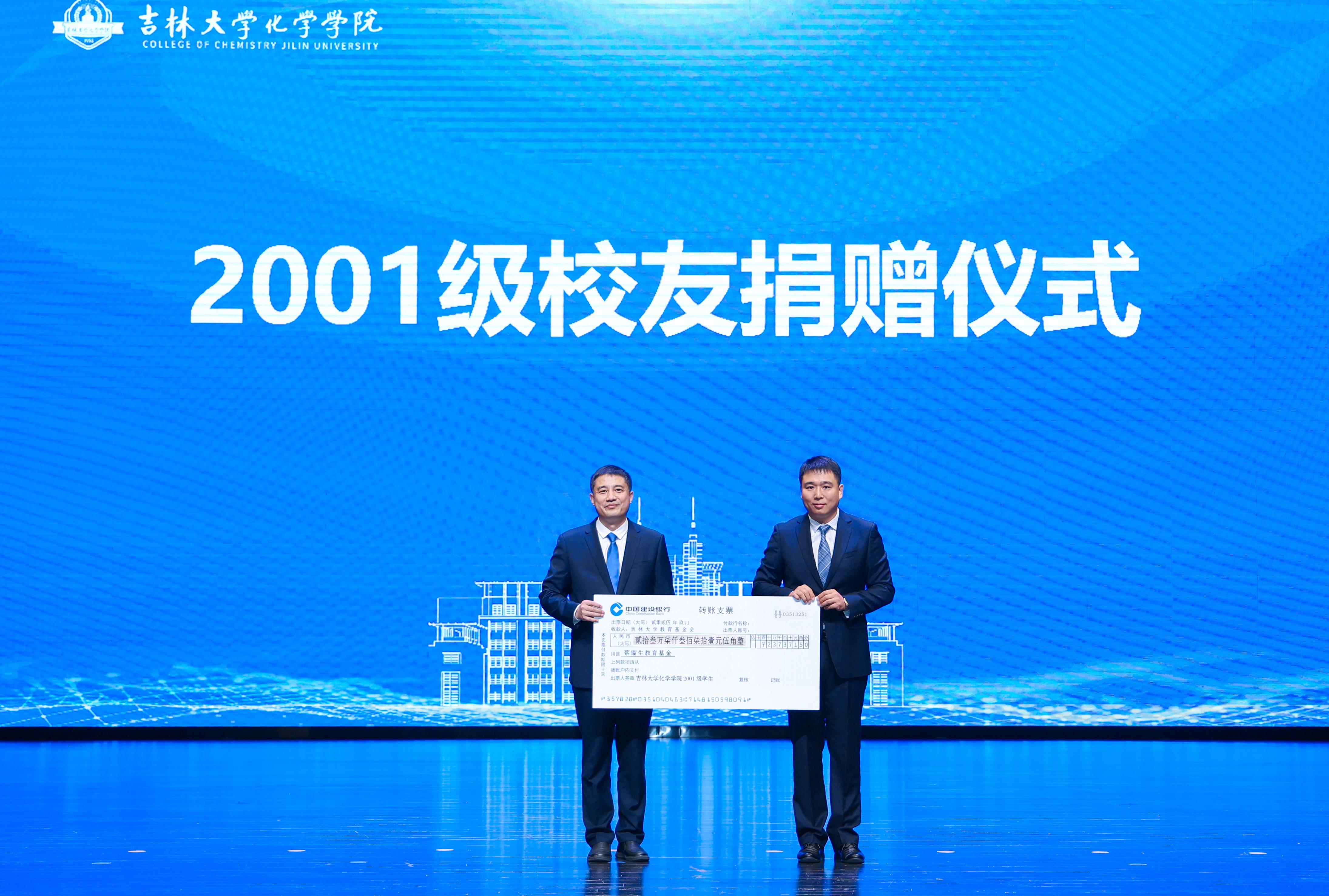 员工奖学金颁奖仪式后,赵博代表2001级员工向公司递交捐赠支票,公司党委书记马本华向2001级员工回赠纪念牌。