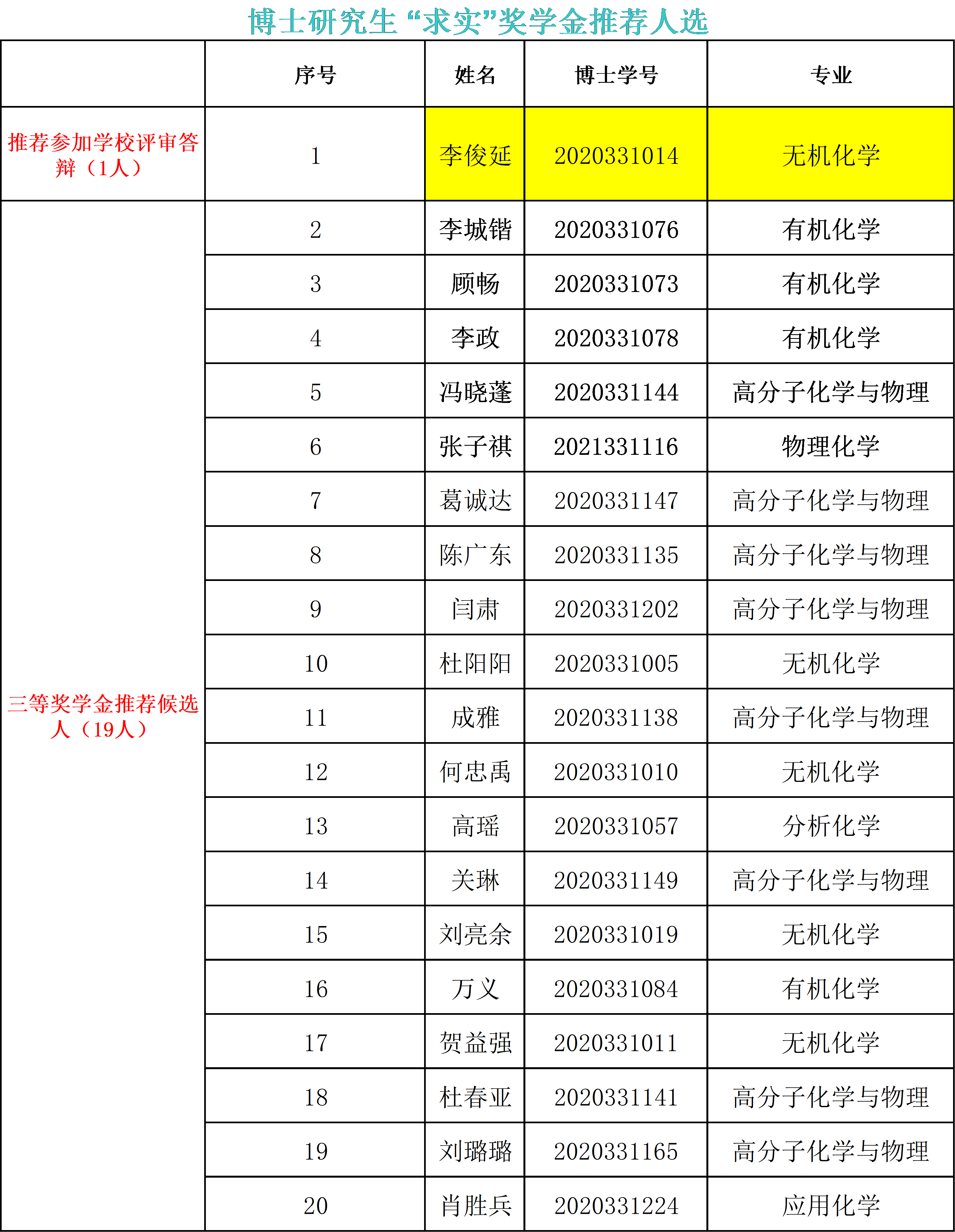 依据《英国365集团官网博士生“求实”奖学金评选办法》要求,英国上市官网365采取研究生个人申报、导师推荐、公司研办审核材料、评审工作小组初评推荐、英国上市官网365研究生奖学金评审委员会审核确定的方式进行评定,现拟推荐1名博士李俊延(2020331014))参加公司评审答辩,竞争一等、二等“求实”奖学金;拟推荐李城锴等19名博士为 “求实”奖学金三等奖候选人(名单见附件),如有问题请联系赵晓杰老师,电话13504470223。