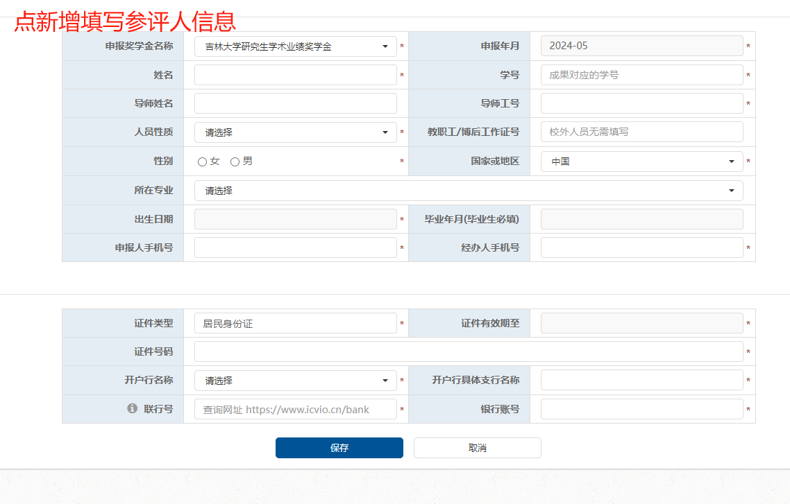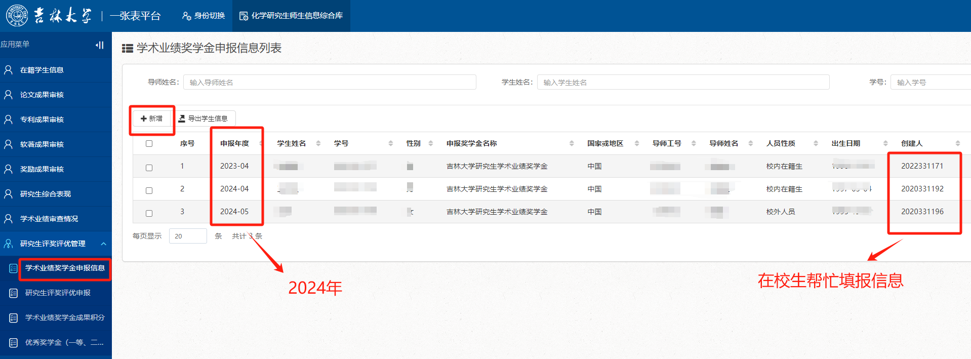 1. 使用个人邮箱账号登录“一张表”平台(https://one.jlu.edu.cn),在“研究生评奖评优管理”- “学术业绩奖学金申报信息”栏点【新增】进行申报人及银行卡信息填报。请申报人务必认真填写和核实银行卡等相关信息,确保准确无误,保证获奖者奖学金及时发放。