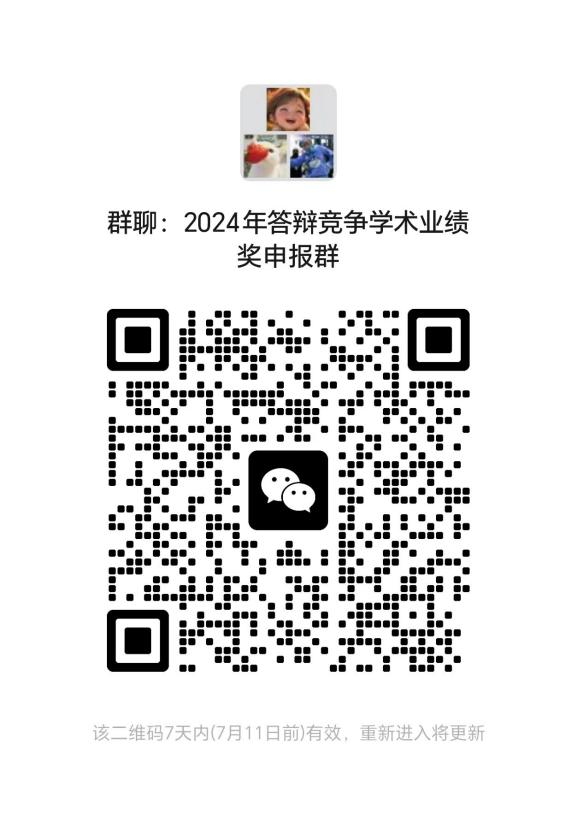 欲以答辩方式申报竞争上一等级奖学金的,即初评【二等奖/三等奖/未获奖】,申请以答辩形式竞争【一等奖/二等奖/三等奖】的,请于7月7日24:00前扫码加入“2024年答辩竞争学术业绩奖申报群”,初评候选人(附件2)序号357-368需通过答辩方式确定4个三等奖人选,不参加答辩的视为放弃竞争机会。