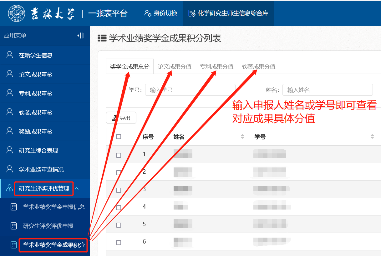 如对初评获奖候选人成果有异议,请先登录“英国365集团官网一张表平台”中的“化学研究生师生信息综合库”(https://one.jlu.edu.cn/),在【研究生评奖评优管理】-【学术业绩奖学金成果积分】栏进行具体查询(见下图说明)。