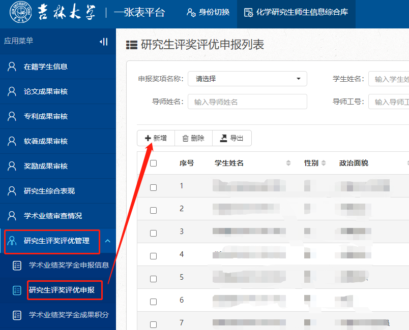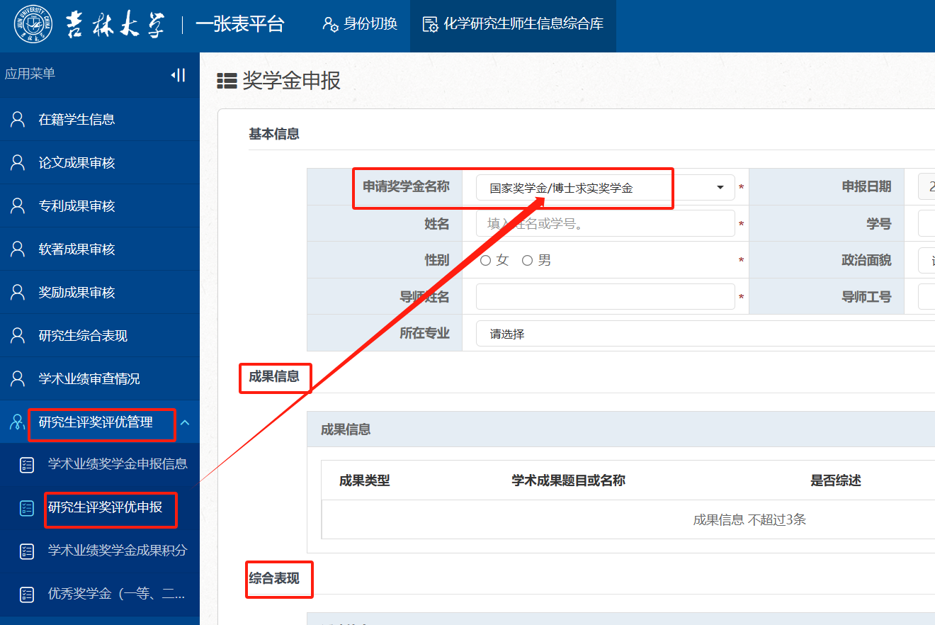 (1)博士研究生国家奖学金和“求实”奖学金合并申报,一次申报可同时申请两类奖学金。硕士研究生使用同一入口申报国家奖学金,申报系统后台自动区分申报人学历层次。申报人应于11月11日16:30前使用个人邮箱账号登录“一张表”平台(https://one.jlu.edu.cn),在“研究生评奖评优管理”-“研究生评奖评优申报”栏,点击【新增】进行【国家奖学金/博士求实奖学金】信息填报。