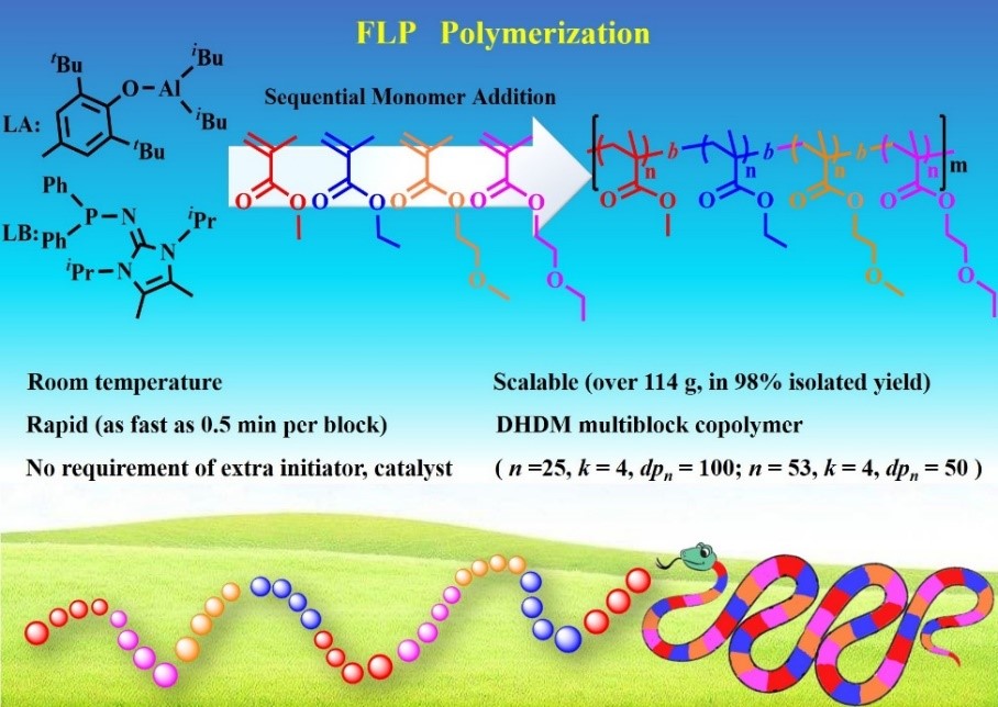 由于体系中同时存在没有被中和的Lewis酸和Lewis碱,“沮丧”Lewis酸碱对(FLP)可以催化许多特殊类型的反应。包括小分子有机反应和高分子合成等。英国365集团官网张越涛教授课题组一直致力于FLP催化高分子活性聚合的研究,并取得一系列开创性成果。最近,他们利用FLP活性聚合体系快速且大量地聚合甲基丙烯酸甲酯(MMA)等四种亲疏水性不同的单体,实现DHDM(double high (molecular weight anddpnvalue) and double multiple (monomers and block numbers))序列可控高分子的合成。得到了世界纪录级的53嵌段序列可控高分子(图),该记录比之前的提高了大约2.5倍。不仅如此,每一嵌段的dpn也由原来的10增加到50。真正的做到了双高和双多(DHDM)。该聚合体系简单易行,在室温下烧瓶中即可完成,除了在反应开始时需要加入催化体系外,其它的嵌段只需连续加入不同单体即可。体系不仅可以高产率的(>98%)实现百克级的放大实验,而且聚合速度也非常快。整个53段聚合只需要不到30分钟就可以合成得到一系列分子量可控且分子量分布较窄的序列可控高分子。上述特征展现了该体系具有非常好的工业化应用前景。