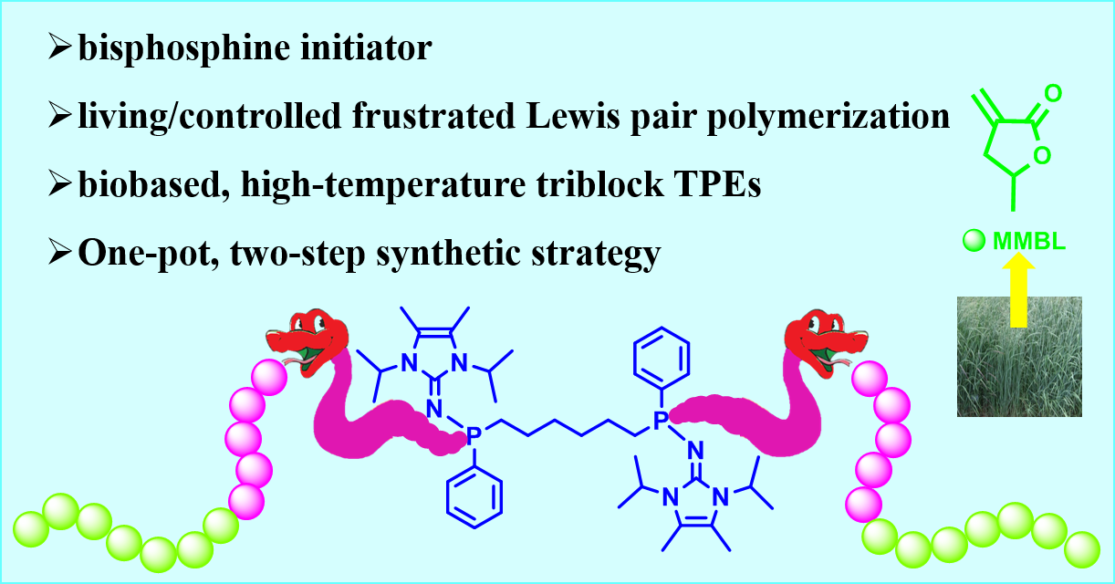 课题组利用FLP体系的催化独特性,在高性能热塑性弹性体合成方面取得了突破性进展。γ-甲基-α-乙烯基-γ-环丁内酯(MMBL)是一种生物质基可再生单体,其聚合物PMMBL具有优良的抗溶剂、抗摩擦和耐热性能,非常适合于作为ABA三嵌段热塑性弹性体的硬段。然而,由于该单体活性过高所导致的这类单体聚合后其它单体不容易聚合,因此,利用传统的加料次序方式很难与丙烯酸酯类单体合成三嵌段聚合物。课题组利用FLP的结构可调变性能,合成了一系列双官能度的Lewis碱,通过从中间向两边引发的方式成功得到了以PMMBL为硬段的弹性体材料。PMMBL的高玻璃转化温度使这类弹性体在130℃高温条件下仍然保持了比较好的弹性体性能(Bai Y, Wang H Y, He J H, Zhang Y T*, Chen E Y-X.Nat Commun.2021,12, 4874,见下图2)。