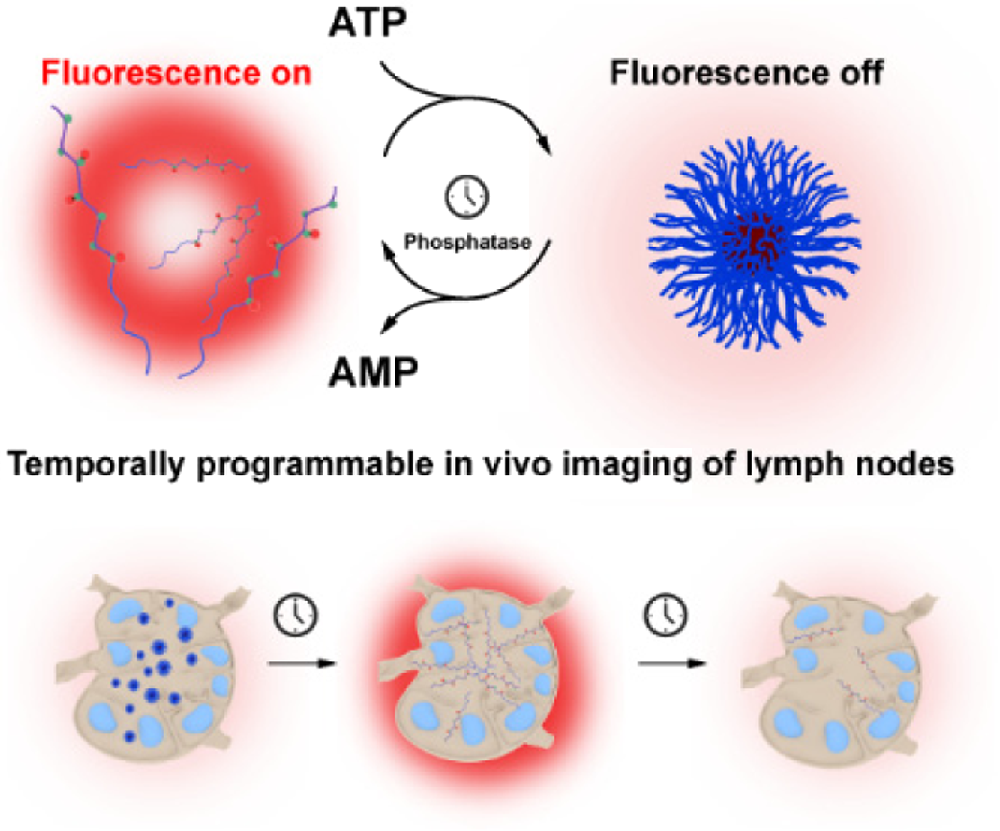 英国上市官网365、超分子结构与材料国家重点实验室李云峰教授团队开发了一种ATP驱动、具有良好生物相容性的聚合物纳米粒子的非平衡自组装体系。通过改变带正电荷的聚合物、ATP和磷酸酶的组分浓度,可调控瞬态聚合物纳米粒子的寿命和耗散自组装循环,继而实现了时间可编程的小鼠淋巴结体内成像。该研究为开发具有良好生物相容性和可编程生物功能的非平衡自组装合成系统提供了新方法和新策略。