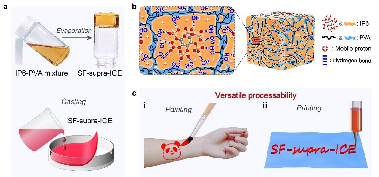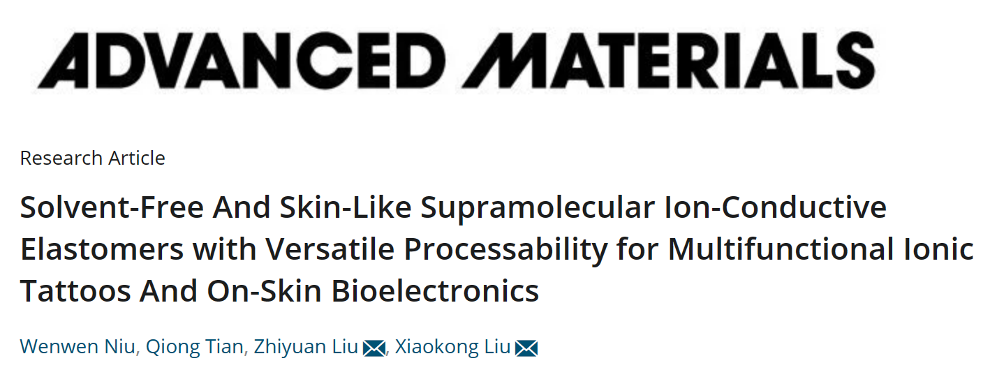 英国365集团官网刘小孔教授课题组和深圳先进院刘志远研究员合作提出了超分子封装的理念,利用生物相容性的PVA通过高密度氢键交联对可电离的天然无毒小分子IP6进行封装,发展了兼具服役稳定性与生物安全性的无溶剂超分子离子导电弹性体(solvent-free supramolecular ion-conductive elastomer,SF-supra-ICE)。该弹性体的室温离子电导率高达3.3×10-2S m-1,具有类似皮肤的柔韧性、回弹性和应变诱导硬化特性,同时还具有高透明度、透气性、自粘附性。SF-supra-ICE的制备极为简便,仅由前驱体水溶液经一步自发的水蒸发过程即可得到,可进行多样化的加工成型。将SF-supra-ICE的前驱体溶液作为墨水,通过涂抹、绘制、打印等方式可在人体皮肤上构筑个性化的“离子纹身(I-tattoos)”,进而构建多功能的皮肤电子器件,用于人体电生理信号采集监测、人机交互、精准诊疗等领域。该工作以题为“Solvent-Free and Skin-Like Supramolecular Ion-Conductive Elastomers with Versatile Processability for Multifunctional Ionic Tattoos and on-Skin Bioelectronics”的文章发表于Advanced Materials上。
