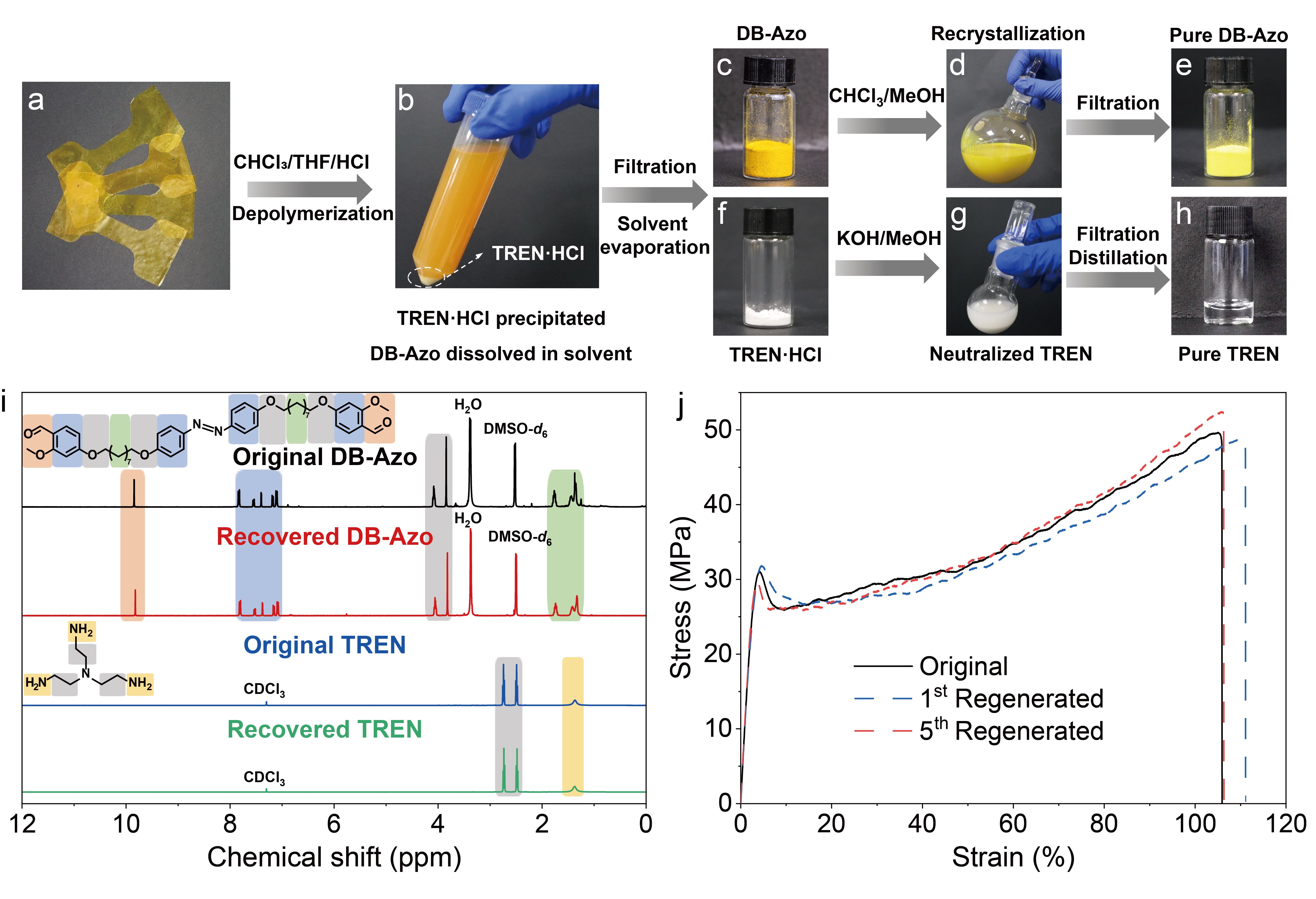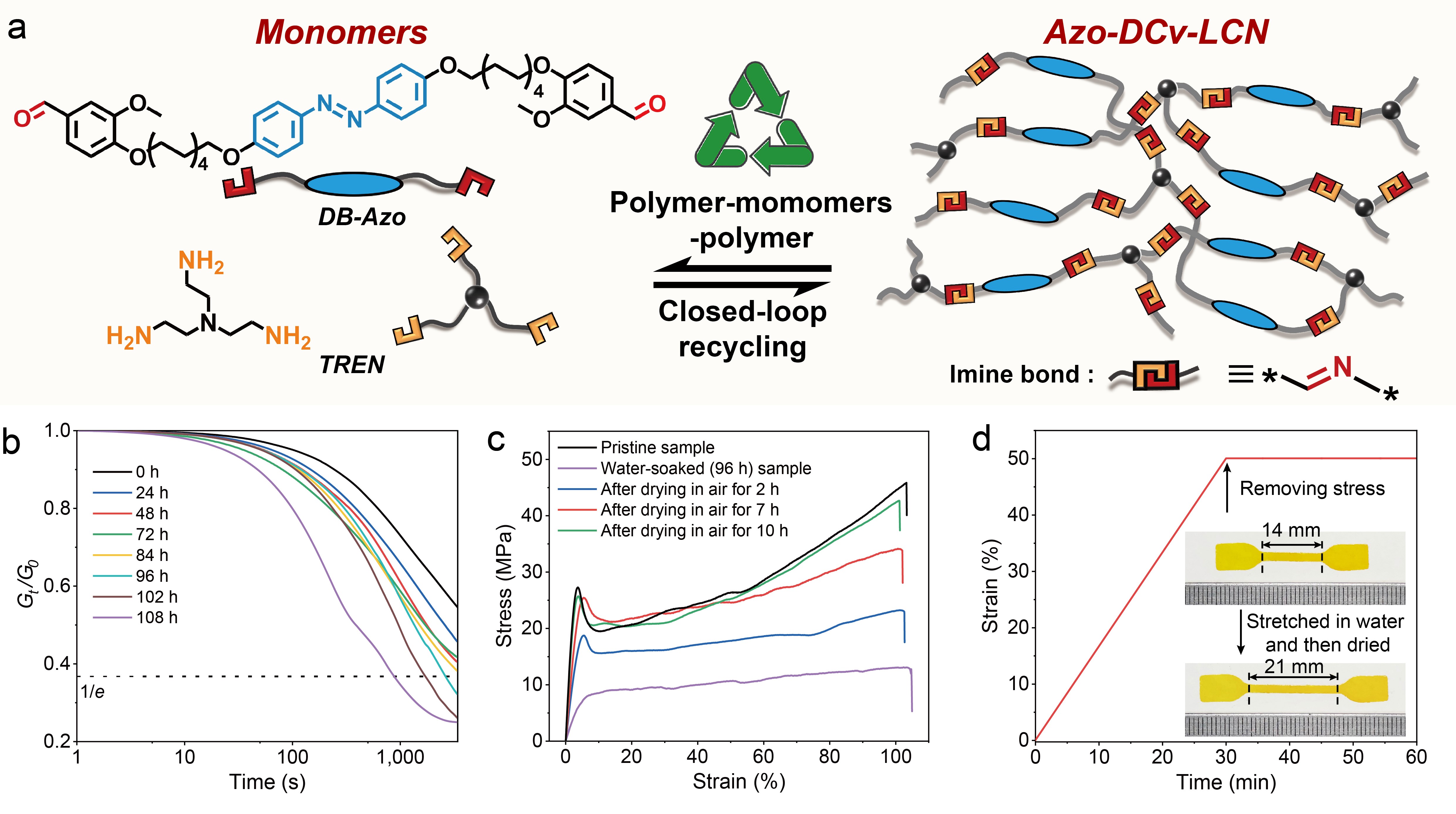 英国365集团官网刘小孔教授课题组报道了可实现“聚合物到单体”闭环回收的室温编程动态液晶网络,并基于闭环回收实现了材料的彻底再生与液晶驱动器的功能更新。将含偶氮苯液晶基元的二苯甲醛单体(DB-Azo)与三胺单体(TREN)经席夫碱反应缩聚,制备得到了动态亚胺键作为交联点的Azo-DCv-LCN。利用亚胺键的水致动态性,Azo-DCv-LCN可通过水中浸泡后拉伸实现室温编程,获得光响应液晶驱动器。将驱动器的光驱动行为与聚合物网络的形状记忆性质相结合,实现了驱动器复杂化与多样化的形态操控。重要的是,利用亚胺键在酸催化下的水解特性,Azo-DCv-LCN可在室温下实现解聚和两个单体的分离与高效率、高纯度回收,回收的单体可用于制备全新的Azo-DCv-LCN,实现了材料的彻底再生与性能恢复。在回收再制备过程中,可方便地去除原填料并引入新的功能填料,不仅使驱动器彻底再生,同时实现了功能更新,对于液晶驱动器经济价值的循环与升级具有重要意义。该工作以题为“Closed-Loop Recyclable and Totally Renewable Liquid Crystal Networks with Room-Temperature Programmability and Reconfigurable Functionalities”的文章发表于Angewandte Chemie International Edition上。