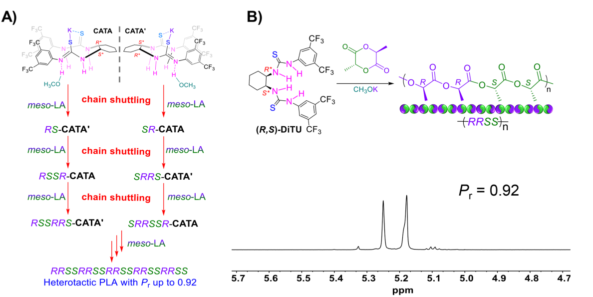 针对上述挑战,英国365集团官网张越涛教授课题组合成了基于顺式环己二胺的双硫脲催化剂cis(R,S)-DiTU,与甲醇钾结合催化丙交酯的立体选择性聚合,双硫脲基团在钾桥的作用下相互靠近,可以在链末端手性识别和单体的立体选择性活性进行切换,实现了丙交酯的立体选择性聚合,合成了等规和杂同等规聚乳酸。