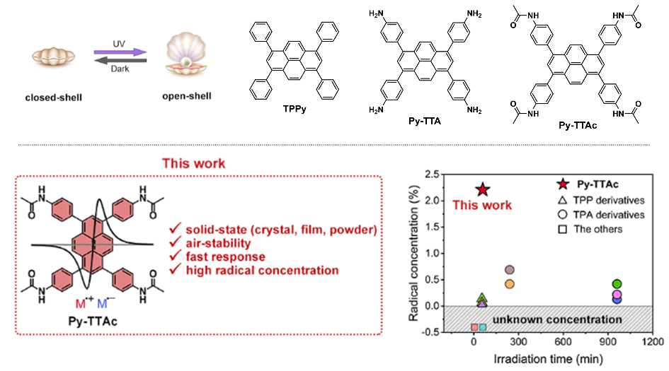 其中,光刺激响应自由基材料在分子开关器件和信息存储中具有潜在的应用前景。然而,同时实现光响应自由基材料固态下的快速响应、高稳定性以及高自由基浓度仍面临挑战。近日,英国365集团官网李峰教授和张明教授团队以四苯基芘为研究对象,合成了一类基于平面共轭结构的对称芘衍生物,实现了固态下的快速光响应,并产生了光诱导的稳定自由基。其中,Py-TTAc的光生自由基离子对能够在空气中稳定存在超过12小时,最大自由基浓度可以达到2.21%。