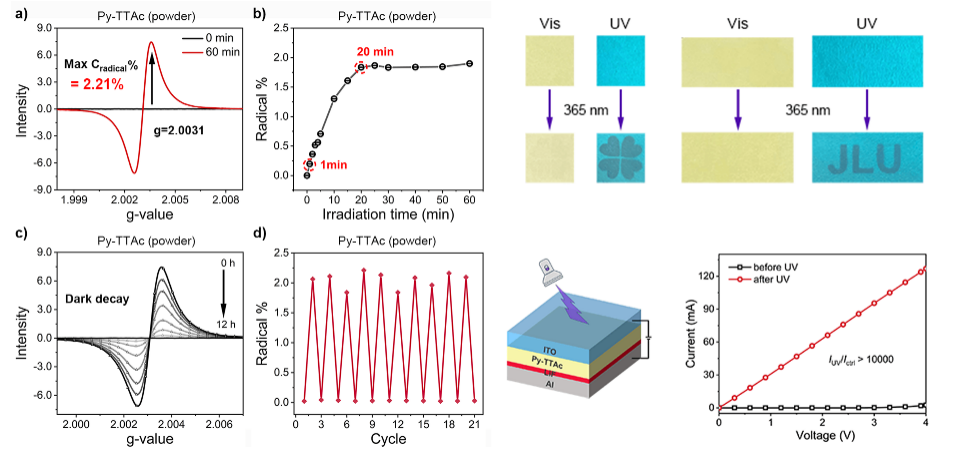 在电荷分离和电荷复合的重复过程中,固体电子顺磁共振(EPR)光谱表明在重复循环期间自由基浓度没有显著降低,Py-TTAc展现出优异的光响应重复性。最后,作者基于Py-TTAc的光生自由基特性,将其应用于防伪纸和光响应导电器件。这项工作不仅推进了光响应自由基材料体系的发展,还为推广具有刺激性响应多功能智能材料提供了新的平台。