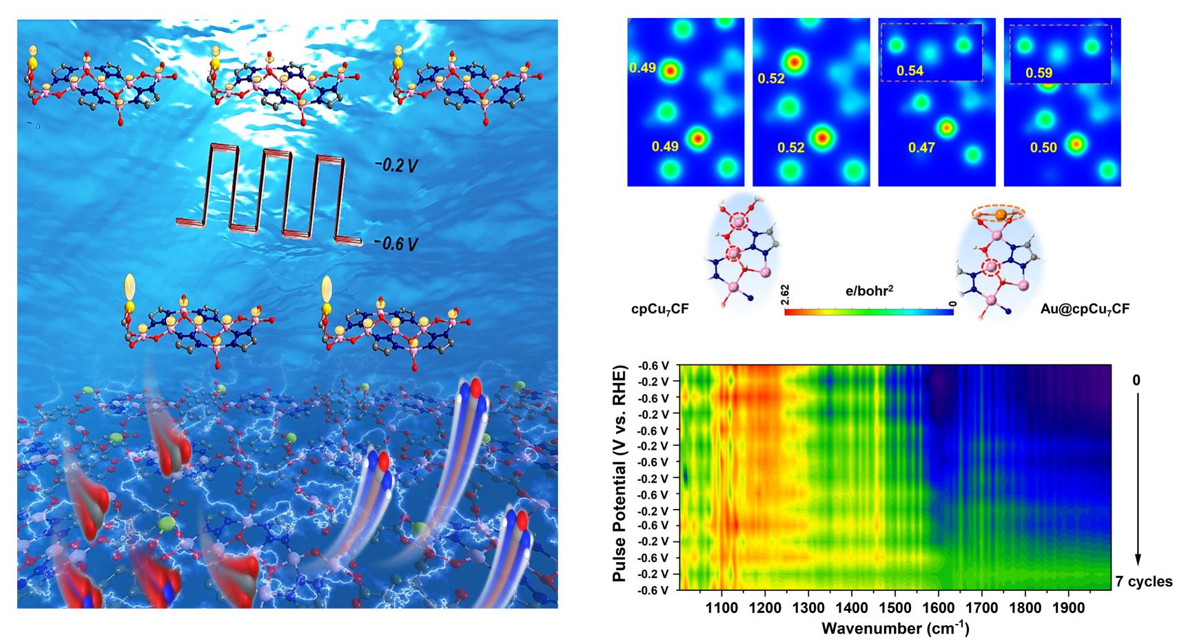针对上述问题,英国365集团官网苏忠民教授/刘靖尧教授、华南师范大学兰亚乾教授团队合作构建了一个动态系统,能够精确控制催化位点的电荷密度分布,从而调节电合成尿素的多个连续步骤,实现高效的尿素合成。研究者们将Au 原子嵌入到共面的Cu7II簇基三维框架中(Au@cpCu₇ CF),打破了原始cpCu₇ CF 的电荷对称性。在动态条件下,随着脉冲电位在−0.2 V 和−0.6 V(相对于可逆氢电极)之间切换,Au@cpCu₇ CF 中Au 和Cu 原子之间的不对称电荷分布程度发生了周期性的动态变化。这种动态可控的电荷振荡能够调节电合成尿素中的多个连续步骤。理论计算结果表明,Au@cpCu₇ CF 的表面电荷密度对施加的电位具有强的响应性。当电位切换至−0.6 V 时,具有高电荷密度的Au 原子增强了对*HNO₂ 和*NH₂ 中间体的吸附,从而抑制了副产物生成路径;在−0.2 V 的低电位下,Au 和Cu 原子位点之间的电荷分布促进了热力学C–N 耦合。研究人员探讨了不对称电荷分布的动态调控在尿素电合成中的重要作用,为未来动态电催化研究提供了参考。相关研究成果近期发表在了Adv. Mater.杂志(Adv. Mater. 2024, 2408510)。