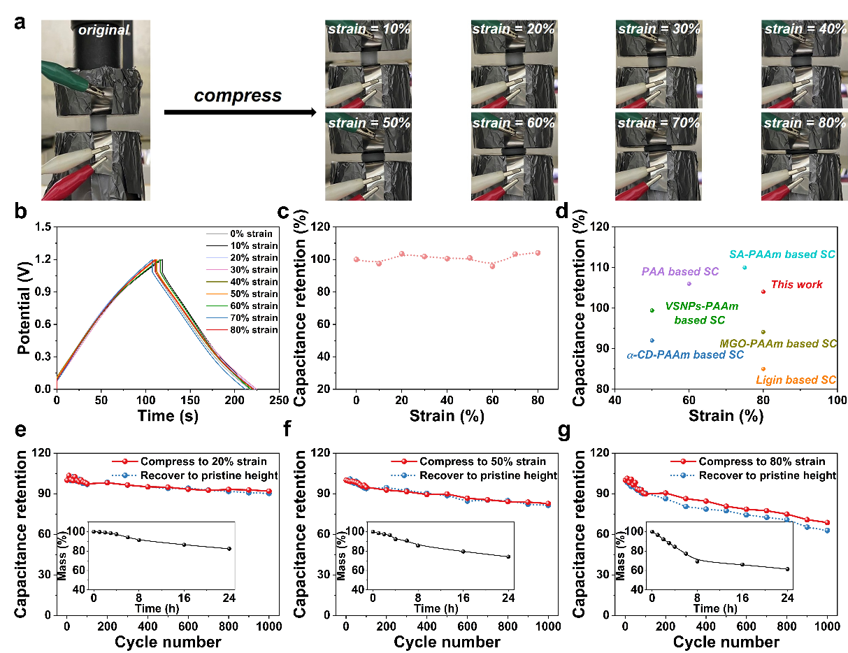 在20%的压缩形变下,经过1000次循环,器件的电容保持率可以达到~91%,在50%的压缩形变下,在1000次循环之后,其电容保持率也可以达到~83%,进一步将压缩形变增加到80%,在循环之后器件的电容保持率依旧可以达到~70%。