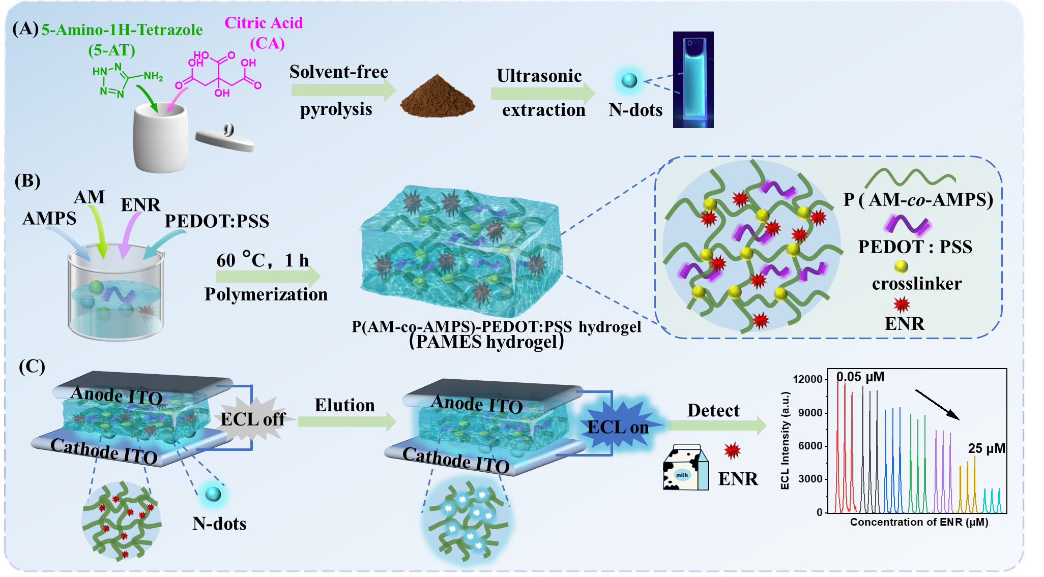 近期,英国上市官网365马强教授课题组开发了一种水凝胶基准固态电解质的电化学发光(ECL)传感器用于检测牛奶中的恩诺沙星(ENR)。研究制备P(AM-co-AMPS)-PEDOT:PSS水凝胶(PAMES)作为准固态电解质,PAMES水凝胶具有较好的离子电导率、粘附性、透明度和含水量。水凝胶基准固态电解质的传感系统克服了传统液体电解质的性能限制,提高了传感器的应用性、便携性和环境适应性,实现了对食品中残留抗生素的成功检测。研究成果以“Quasi-solid hydrogel electrolyte/nitrogen dot-based electrochemiluminescence sensor for enrofloxacin detection in milk”为题,于3月12号发表在Food Chemistry期刊(doi.org/10.1016/j.foodchem.2025.143890)。