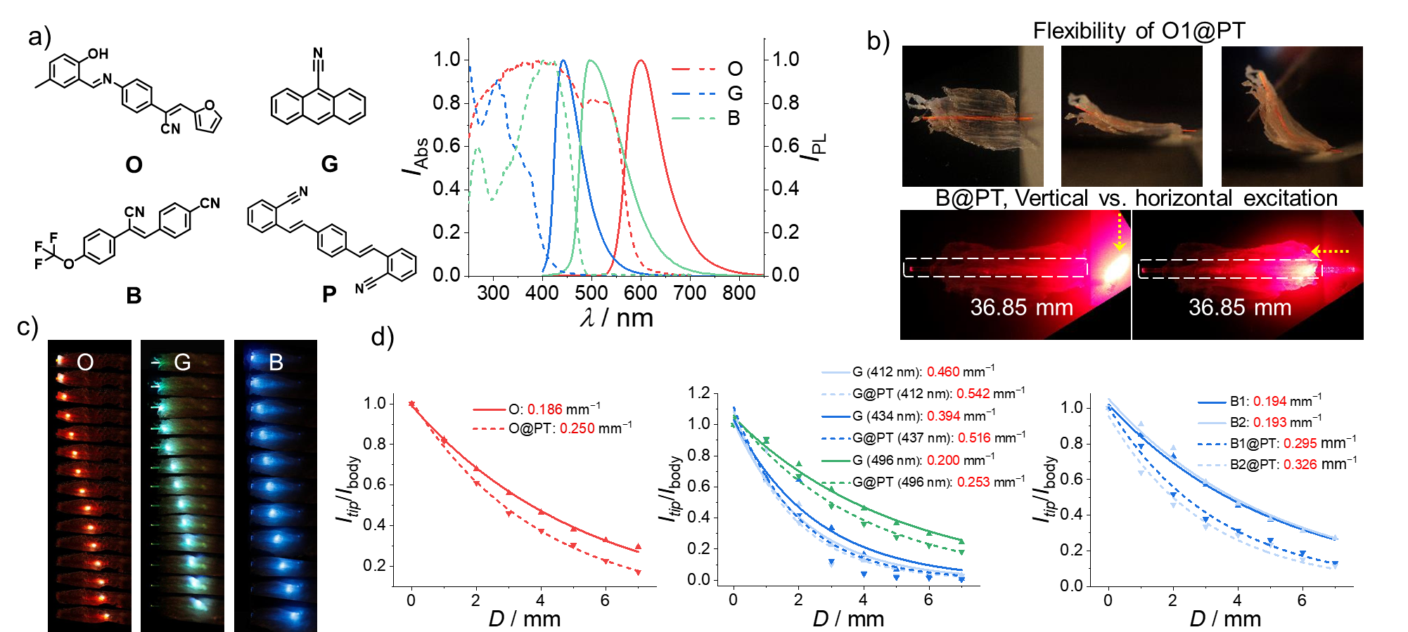 图2.有机晶体O、G、B和P的化学结构、吸收发射光谱以及其嵌入组织切片中的光传输能力