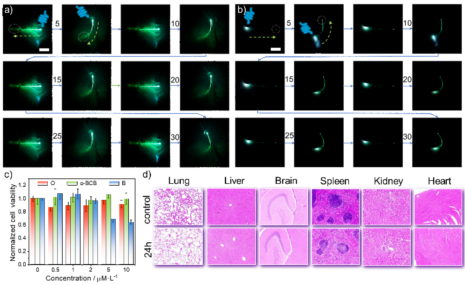 为实现柔性有机晶体在活体内的精准植入,本研究通过磷酸盐缓冲液(PBS)推动,成功将长约2 cm的晶体嵌入小鼠皮下深度达1.1 cm处,并确保有近1 mm的晶体部分悬露于皮外(图3a)。植入后,通过分别采用375 nm与654 nm光源激发,晶体不仅能在体内有效传输信号,还分别展现出主动发光(发射绿光)与被动传输(传递红光)的双重波导功能(图3b-d)。