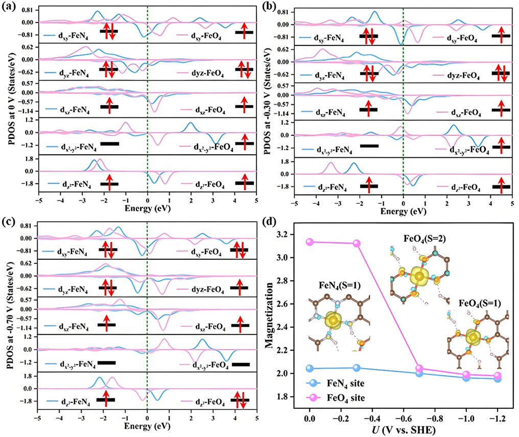 为进一步阐明脉冲调控机制,研究团队对FeN₄与FeO₄在不同电位下的电子结构进行了分析。结果表明,FeO₄位点在由–0.7 V切换至0 V时,自旋态由低自旋(S=1)转变为高自旋(S=2),伴随着自旋密度与磁矩的同步变化(图3)。该自旋态演化有效促进了CO迁移与C–C偶联,为脉冲催化的电子电子本质提供了理论支撑。