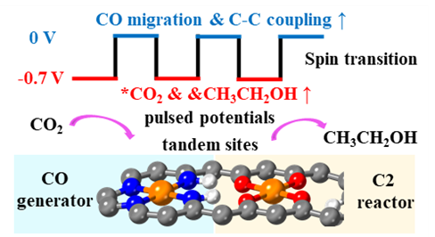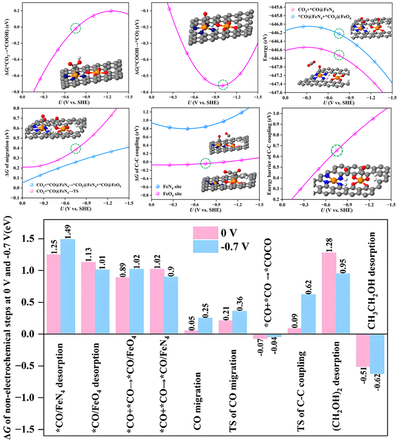 在前期研究中,研究团队基于仿酶催化原理,构建了一系列单原子纳米酶,并借助机器学习特征工程提出了基于电子结构的催化性能描述符,高效筛选出多种CO2还原反应(CO2RR)潜在催化剂(ACS Catal. 2024, 14, 14021)。在此基础上,团队进一步模拟乙烯形成酶中FeO4活性中心的特征,构建出含FeN4与FeO4双位点的串联催化剂体系(图1),实现了CO₂活化、CO生成与C–C偶联的空间分工,并在–0.7 V(vs. SHE)下实现乙醇的高效生成。进一步分析表明,CO在FeN₄位点生成后易于向FeO₄位点迁移,随后在较低能垒下与第二个CO分子发生C–C偶联形成C₂产物(图2)。然而,进一步计算显示该过程的能垒随电位变负而上升,为引入电位调控策略提供可能。研究团队由此提出脉冲电催化策略,在–0.7 V与0 V之间周期切换,精准调控关键步骤热力学与动力学:在0 V时,CO迁移和C–C偶联的能垒分别从0.25 eV和0.62 eV降至0.05 eV和0.09 eV,并抑制中间体过度还原;而–0.7 V则有利于CO₂吸附与关键中间体(如*CH₃CH₂OH)形成。该策略显著提升了乙醇产率与选择性。
