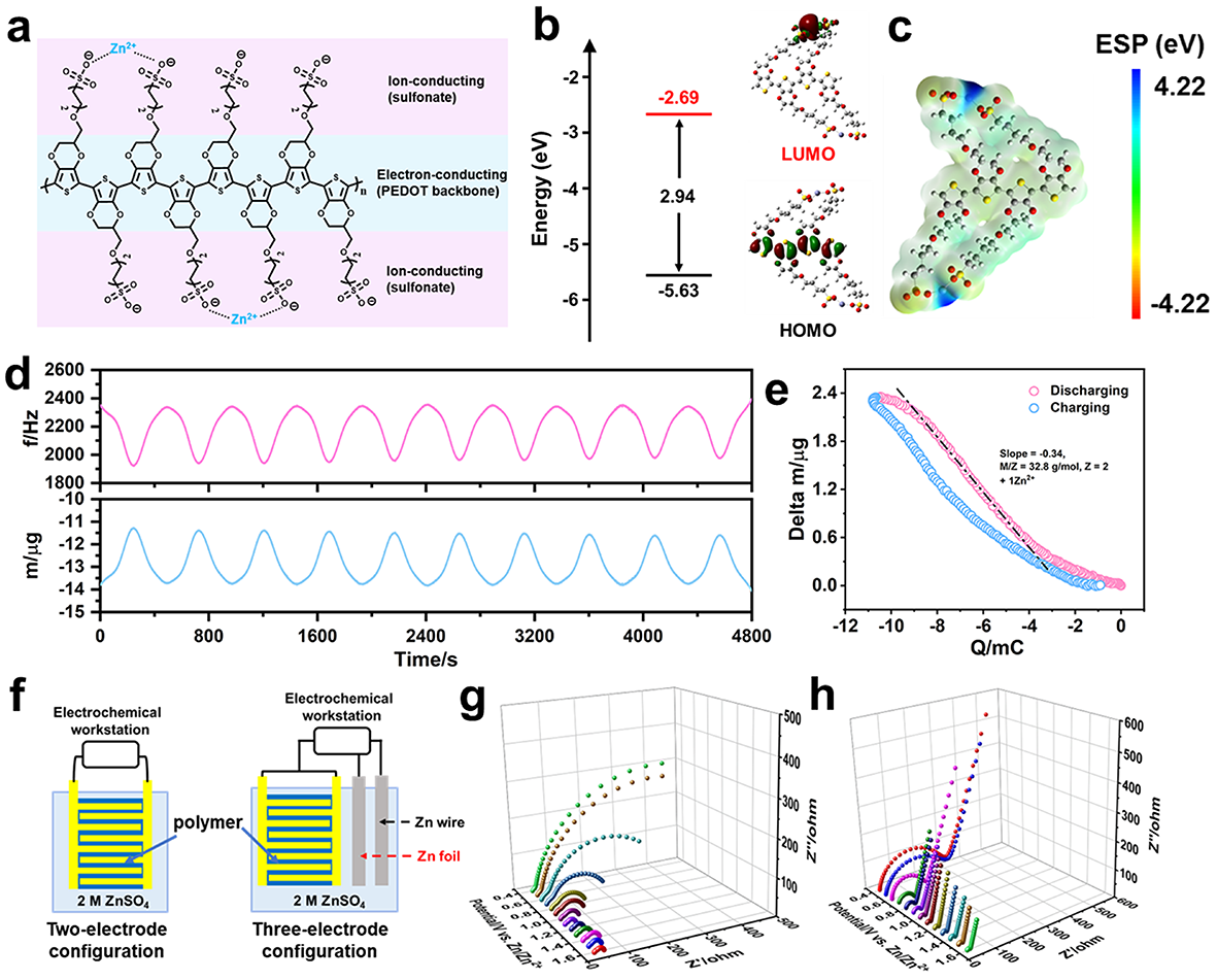 针对这一问题,英国365集团官网晁单明教授联合吉林师范大学冯明教授,中科经理春应化所王颖教授团队,提出一种集成式的有机混合电子/离子导体(OMEIC),通过空间耦合电荷传输路径,实现电荷(Zn2+/e-)的重新分配和快速传输。通过原位石英晶体微天平技术揭示了OMEIC的自掺杂行为和锌离子配位/解离的独特电荷存储机制。并通过原位电化学阻抗技术研究了OMEIC的电子/离子电导率随实时电位的变化,证明了其在时间尺度上固有的优异导电特性。通过钒氧化物的层间限域作用,在纳米尺度上构建双导电路径,进而提高电荷密度并加速离子扩散,产生更多的活性位点并加速反应动力学,从而增强正极的实际电化学性能。