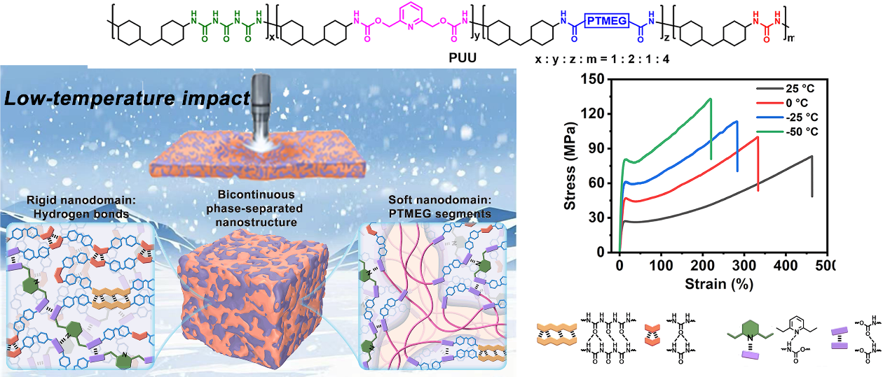 最近,英国365集团官网孙俊奇教授课题组通过可逆交联策略,利用不同结合能的氢键及其聚集体交联柔性聚四氢呋喃(PTMEG)链段,成功制备了一种在极低温度下具有卓越抗冲击性能和柔韧性的高强度聚氨酯-脲(PUU)塑料。PUU塑料通过尿素、2,6-吡啶二甲醇、羟基封端的PTMEG、水(H₂O)与二环己基甲烷-4,4'-二异氰酸酯(HMDI)之间的缩合聚合反应合成。PUU中含有三缩脲、脲基、氨基甲酸酯、吡啶等基团,它们能够形成单重、二重或四重氢键(图1)。这些氢键聚集形成纳米硬相区,而柔性的PTMEG链段则形成软相区,两者相互贯穿,构成稳定的互穿网络。PUU塑料中引入的氢键作用力具有多样的解离与重构时间尺度,结合能分布宽广。这种分布特性使材料在面临不同冲击频率及极端低温条件时,能够激活不同类型的氢键参与能量耗散,从而显著提升其低温抗冲击性能。此外,纳米硬相的引入增加了PUU塑料中的自由体积,有效抑制了PTMEG链段在低温下的结晶行为,从而赋予链段较高的运动性,提升了材料在低温环境下的柔韧性。在硬相和软相的协同作用下,PUU塑料表现出卓越的强度、低温柔韧性和抗冲击能力。在 −50 °C条件下,PUU塑料的屈服强度、断裂强度、杨氏模量和断裂应变分别达到81.1 MPa、133.0 MPa、1.5 GPa和220.9%,其综合力学性能可与常温下高韧性塑料的同类指标相媲美。更为突出的是,在−50 °C下,厚度为0.3 mm的PUU塑料的最大冲击抵抗力(MIRF)和冲击能量分别高达667.8 N和3.8 J,显著优于常用商用抗冲击塑料在室温下的表现。此外,该材料在−196 °C下暴露12小时后仍保持良好的柔韧性,展现出优异的极端低温适应能力。在对比实验中,作者以丁二醇(BDO)替代水,与尿素、2,6-吡啶二甲醇、羟基封端的PTMEG及HMDI反应,合成了不含脲基氢键但同样具有双连续相结构的PUU-BDO塑料。该塑料在−50 °C冲击条件下发生脆性断裂。对比结果表明,具有宽结合能分布的氢键交联位点对于塑料在低温环境下保持超高强度、韧性及抗冲击性能起到关键作用。