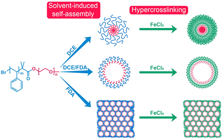 英国365集团官网乔振安教授课题组设计合成了两亲性嵌段共聚物聚乙二醇-聚苯乙烯(PEO-b-PS),通过溶剂诱导嵌段共聚物自组装的方法合成了具有多级孔结构的超交联聚合物。与前人的工作不同,该方法创造性地把模板剂与前驱体结合在一起,用嵌段共聚物PEO-b-PS在甲缩醛与1,2-二氯乙烷混合溶剂中形成的胶束作为反应的“单体”,通过交联反应将不稳定的胶束转化为稳定的超交联聚合物。而通过调节胶束的组装状态,就可以改变所得到产物的形貌。