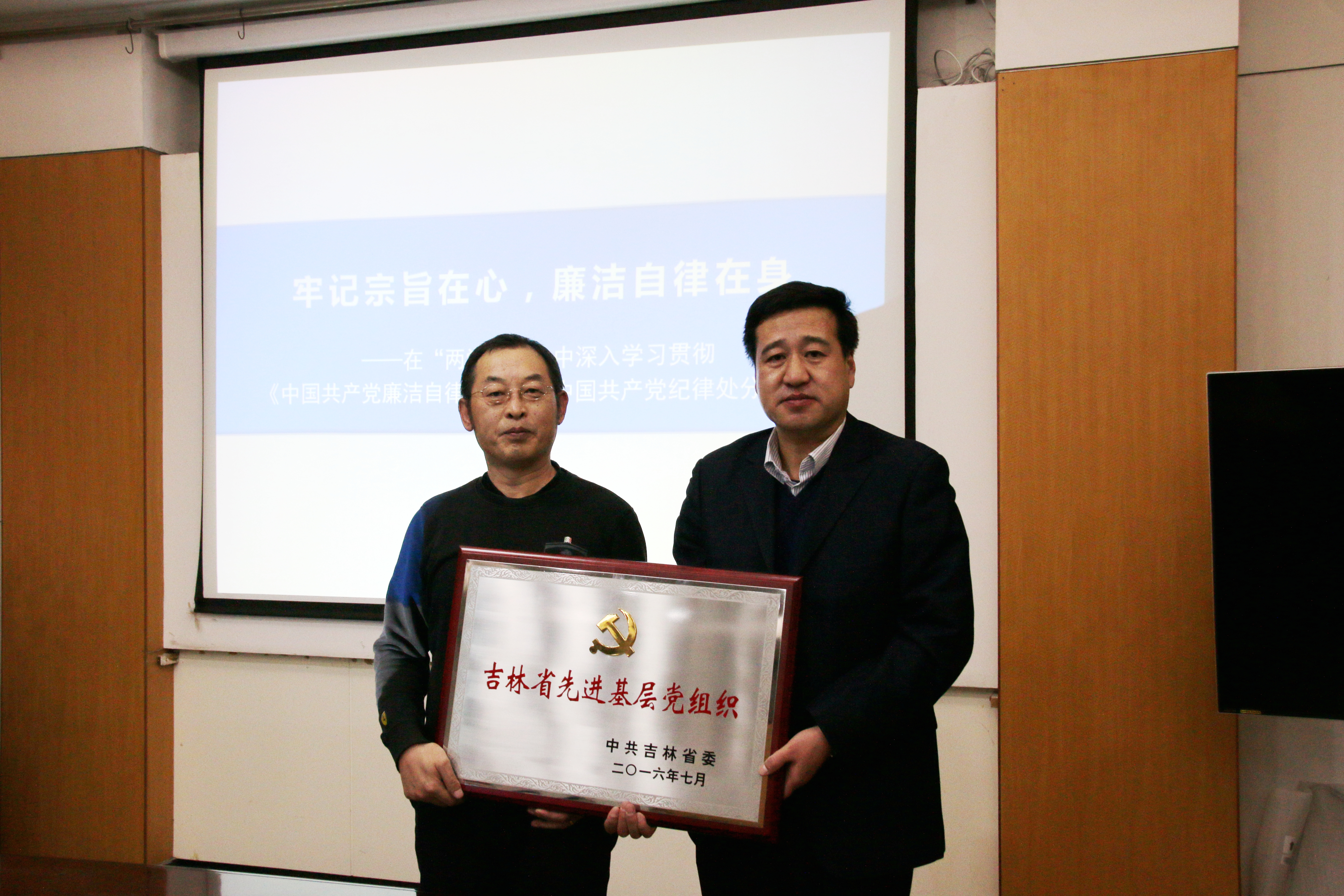 首先,公司党委书记丁世海受公司党委指派,向大家传达了关于吉林省委组织部授予高分子教工党支部“吉林省先进基层党组织”、省高校工委授予高分子教工党支部“先进基层党组织标兵”称号的决定,并向支部颁发奖牌、荣誉证书及奖金。丁书记对高分子教工党支部在推动公司整体党建工作中发挥的作用给予了充分肯定,他希望高分子教工党支部能以“两学一做”学习教育为契机,继续加强党支部和党员队伍建设,充分发挥党支部的战斗堡垒作用和党员的示范引领作用,带动高分子学科的师生凝心聚力,为公司发展贡献力量。