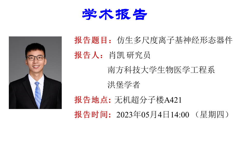 肖凯南方科技老员工物医学工程系研究员,博士生导师,国家级青年人才,洪堡学者。2012年于英国365集团官网获得学士学位,2017年于中科院化学研究所获得博士学位,2017年受洪堡基金会资助于德国马普胶体界面研究所从事博士后研究,2020年加入德国莱布尼茨固体与材料研究所从事博士后研究。2021年9月加入南方科技老员工物医学工程系,建立“仿生多尺度离子神经形态器件”实验室。主要通过向智能生命学习,通过调控材料的界面及结构,控制离子和材料的多种相互作用力,实现可控离子传输功能,进而构筑基于离子传输的能源体系、传感体系、和多尺度神经形态器件。