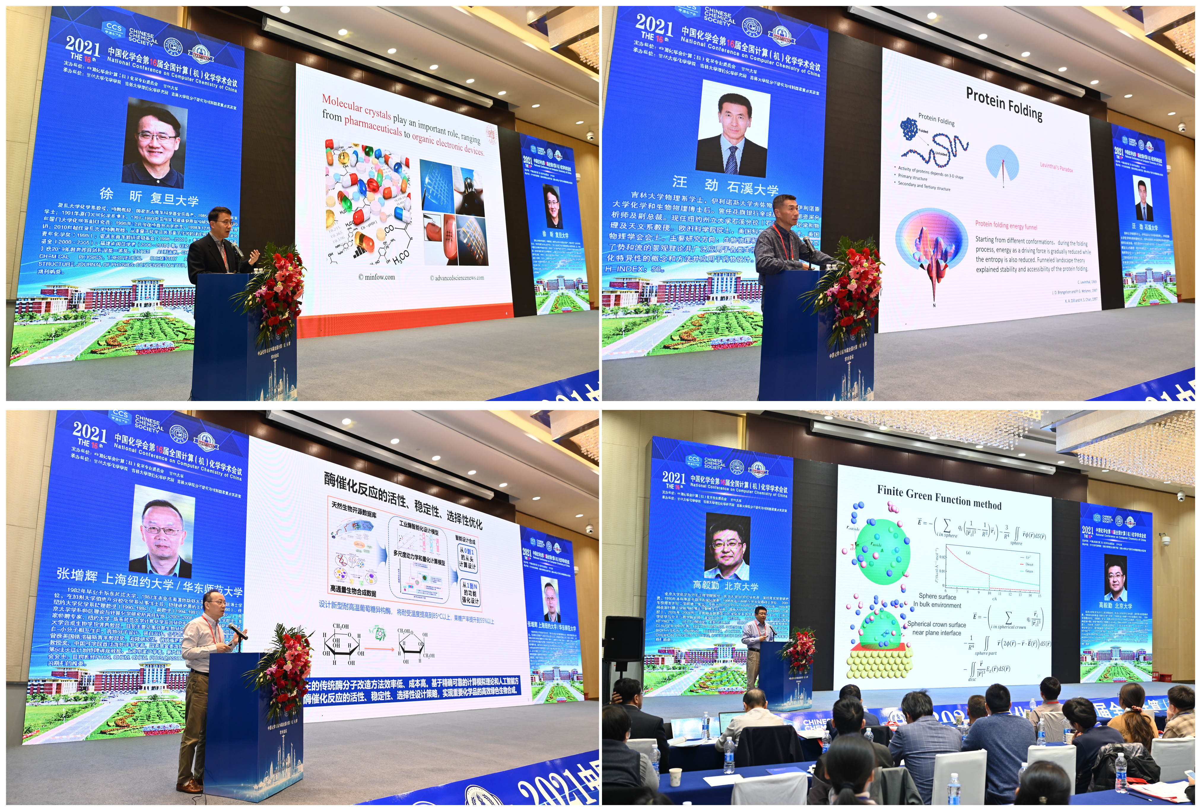 开幕式结束后,复旦大学徐昕教授、美国Stony Brook University汪劲教授、上海纽约大学/华东师范大学张增辉教授、北京大学高毅勤教授分别作了题为“The XYG3 type of doubly hybrid density functionals: from molecules to molecular crystals”、“Physical Principles and Landscape Models of Passive and Active Biomolecules”、“蛋白-配体相互作用的结构预测与自由能计算”、“分子模拟与机器学习结合方法发展与软件实现”的大会报告。在4个分会场内,与会专家学者先后作了150个邀请及口头报告,以及140个墙报展示。