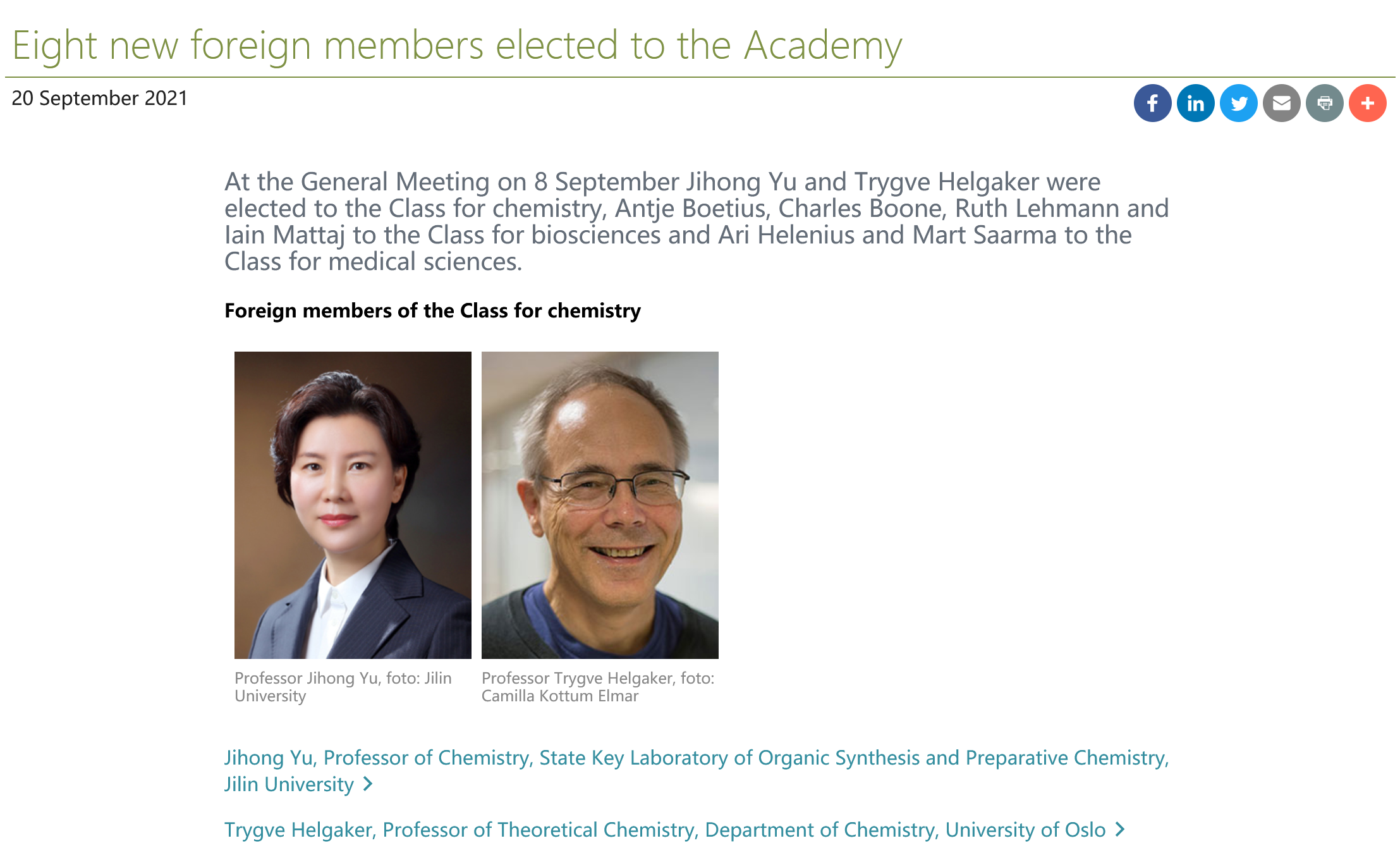 瑞典皇家科公司本次新增8位外籍院士,其中化学学科新增2位。目前,化学学科外籍院士共计16位,于吉红教授是其中唯一一位中国科学家。