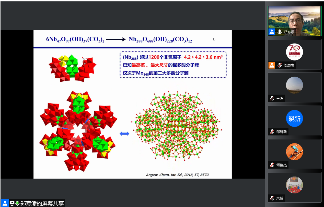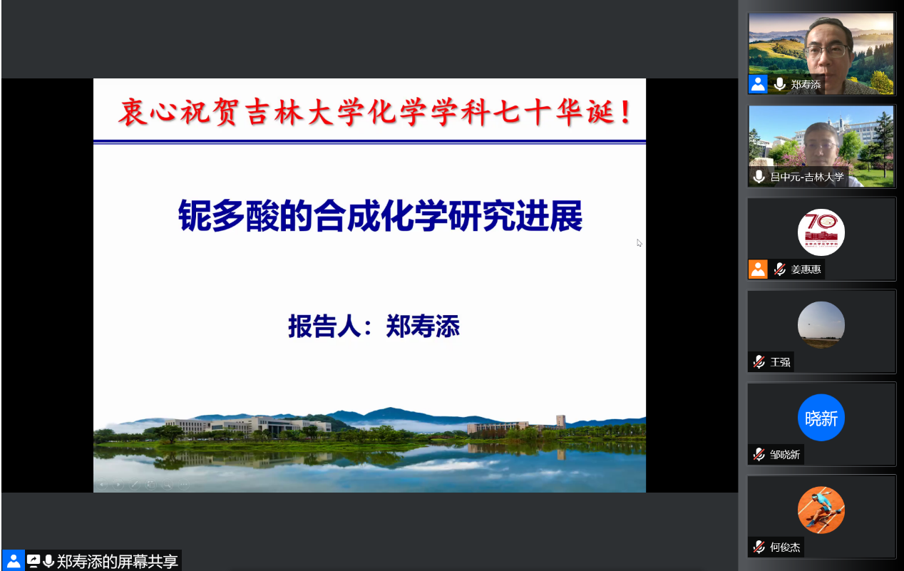 6月12日上午,福州大学英国上市官网365经理,教育部领军人才郑寿添应邀线上做客“吉大化学七十年——科学与未来系列讲座”,以“铌多酸的合成化学研究进展”为题,为公司师生作学术报告。