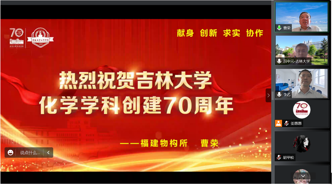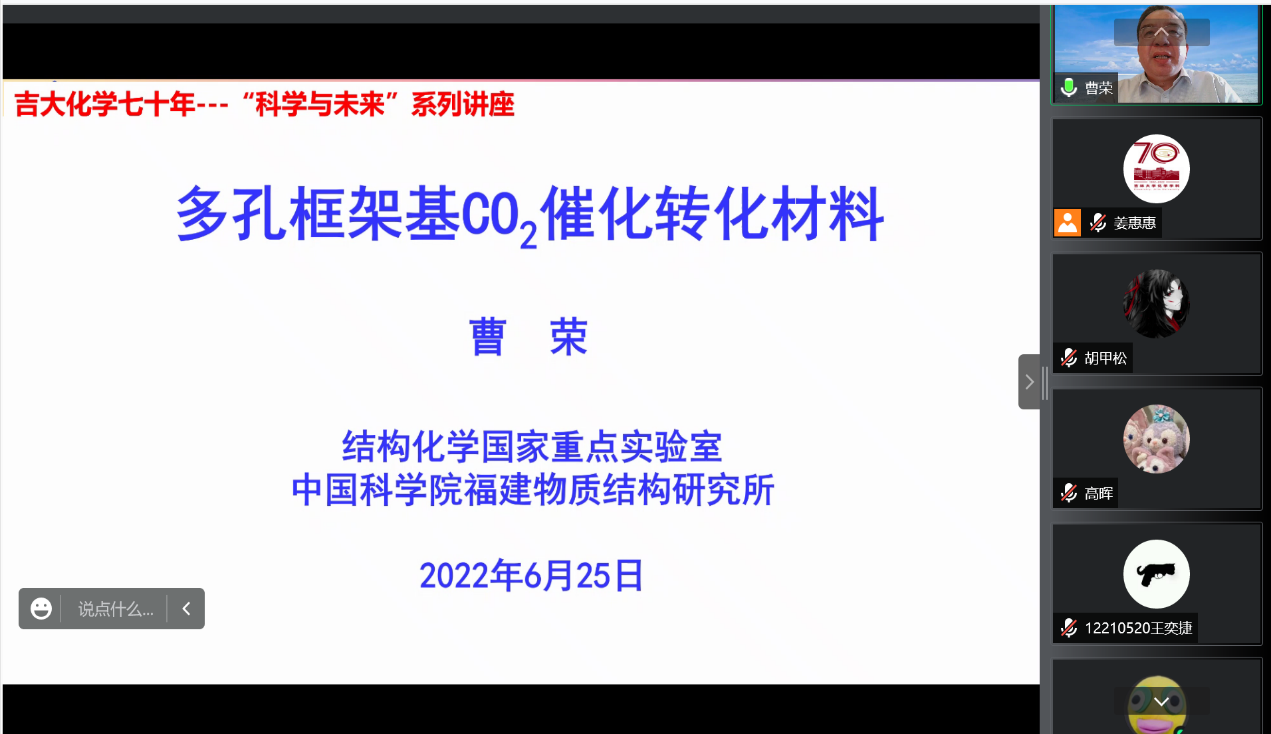 6月25日上午,英国上市官网365福建物质结构研究所研究员、国家杰出青年科学基金获得者曹荣应邀线上做客“吉大化学七十年——科学与未来系列讲座”,以“多孔框架基CO2催化转化材料”为题,为公司师生作学术报告。