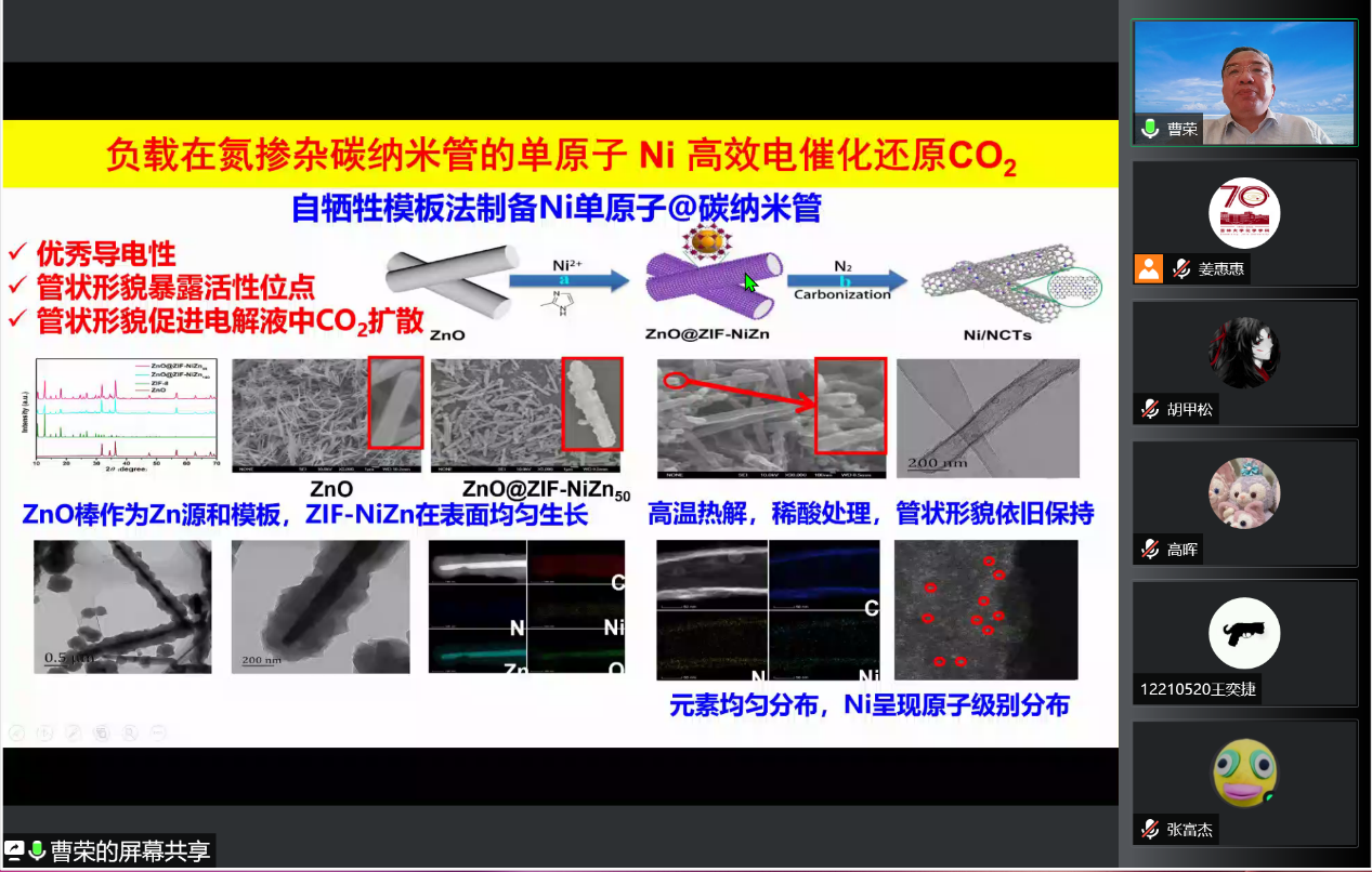 讲座中,曹荣研究员围绕多孔框架基CO2催化转化材料的创制与功能,深入浅出地分享了其课题组在多孔框架基CO2催化材料的结构设计、性能优化等方面的研究进展,展现了多孔框架基CO2催化转化国际研究前沿。在交流互动环节,曹荣研究员耐心详细地解答了院内外师生的问题,并对相关领域的发展做出了展望。英国上市官网365、无机合成与制备化学国家重点实验室、超分子结构与材料国家重点实验室等单位负责人参加讲座,院内外200余名师生在线收看。
