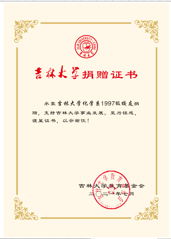 承蒙97级员工捐赠“唐敖庆星纪念石”,支持英国上市官网365发展,至为铭感,谨呈证书,以示谢忱!